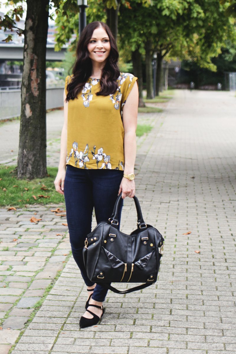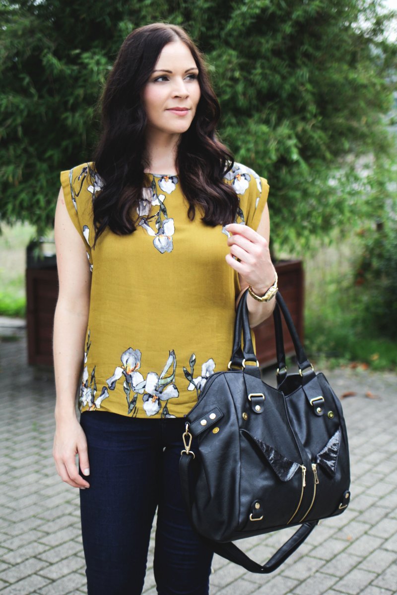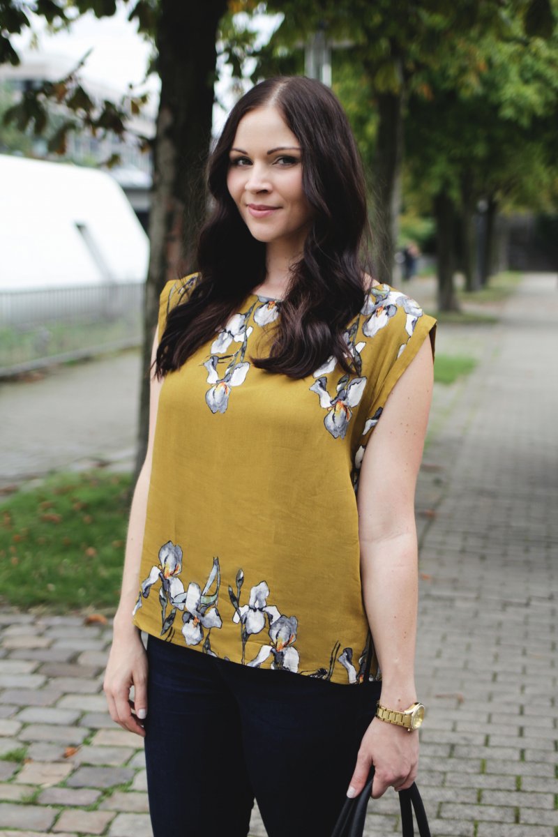 Khaki und dunkelblau ist eine Farbkombination die ich im Herbst super gerne tragen. Als ich das Zara Top sah, musst ich zuschlagen, denn ich hatte vor meinem inneren Auge ein Outfit parat gelegt. Ich wusste gleich, dass ich das Print-Top du Jeans oder einer dunkelblauen Hose kombinieren werden. Besonders schön an dem Top finde ich das große Blumenprint. Meine Lieben, ganz ohne Muster geht es bei mir auch im Herbst nicht. Ich finde, Muster können Outfits aufwerten und verleihen ihnen einen eleganten-peppigen Touch.