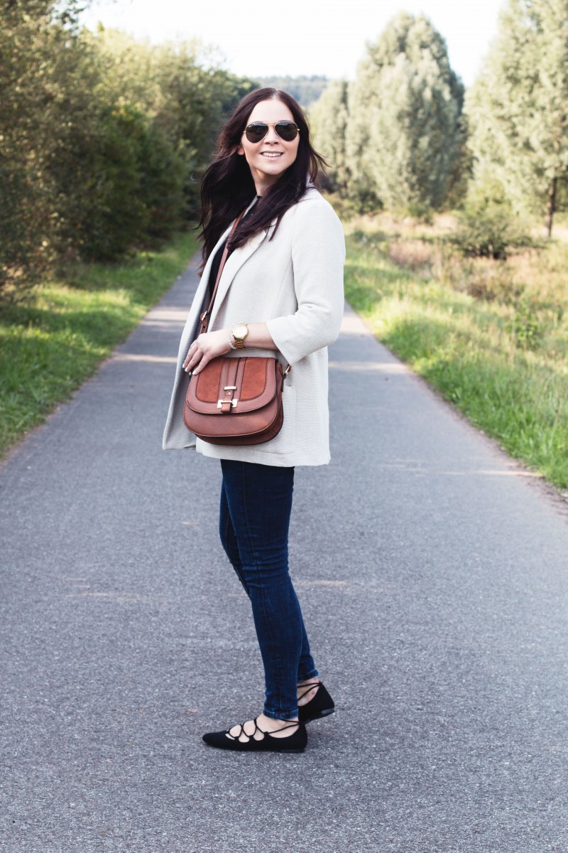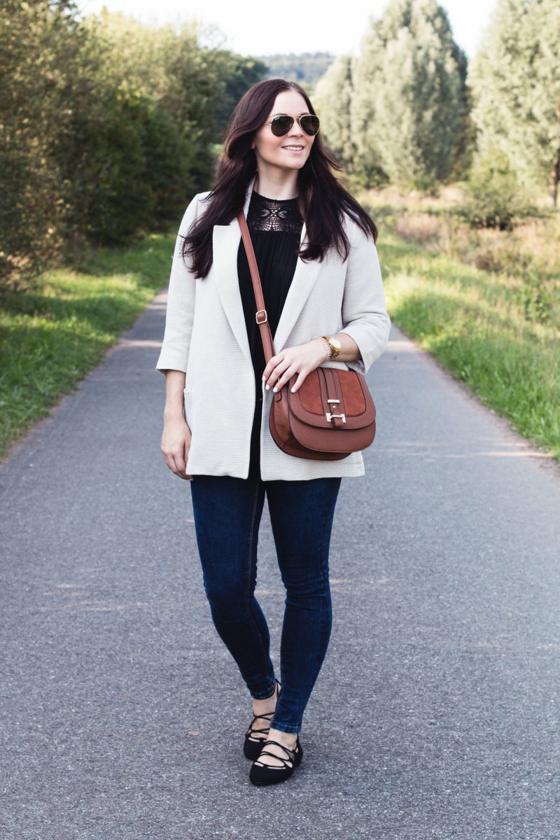 Den neusten Blazer in Kleidermaedchen Kleiderschrank habe ich ganz klassisch mit Skinny Jeans und Spitzenbluse kombiniert. Aufgepeppt habe ich den Look mit den schwarzen Lace Up Ballerinas, der braunen New Look Tasche und der Ray-Ban Sonnenbrille auf meiner Nase.