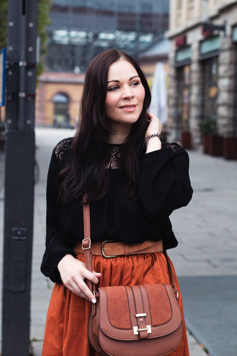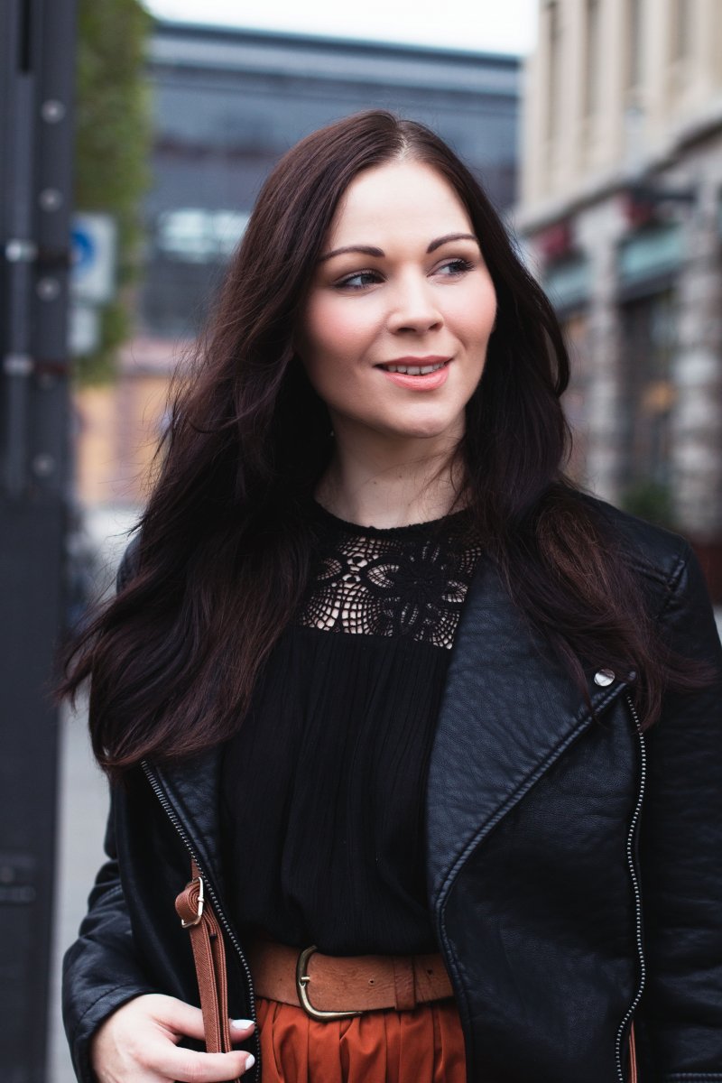 Im Mittelpunkt des heutigen Outfits stehen die Lederjacke von Topshop und der Midirock von Zara. Die beiden Teile bilden ein starkes Team für warme sowie kühle Herbsttage. Kombiniert habe ich beides mit einem schwarzen Spitzentop von Zara und einer schwarzen Lederleggings von Vila. Das Spitzentop kennt ihr ja bereits aus meinem Outfit: Going out in Zara Style.