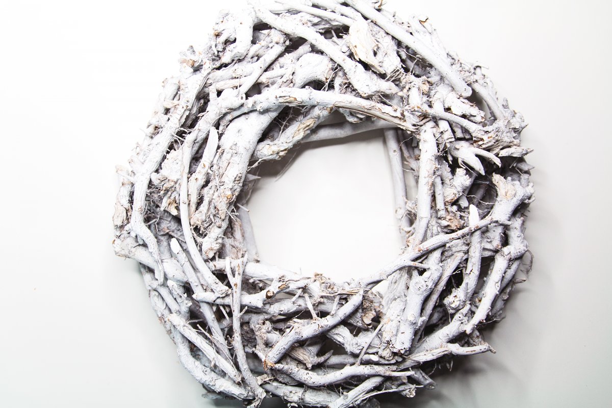 - Adventskranz aus Holz in weiß (Ich habe meinen Kranz geschenkt bekommen. So ein Kranz lässt sich aber ganz leicht selber machen. Ihr benötigt: ein Paar Äste aus dem Wald, Heißkleber und Schneespray oder weiße Farbe.)