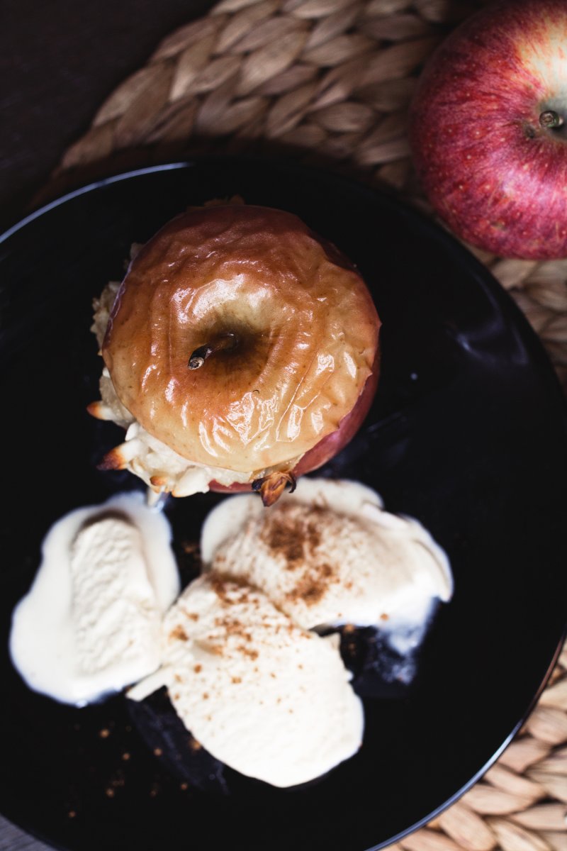 - Vanilleeis auf 2 Tellern verteilen und mit etwas Zimt bestreuen. Bratäpfel aus dem Backofen nehmen und auf die Teller verteilen. Sofort heiß servieren. Ich wünsche euch einen guten Appetit.