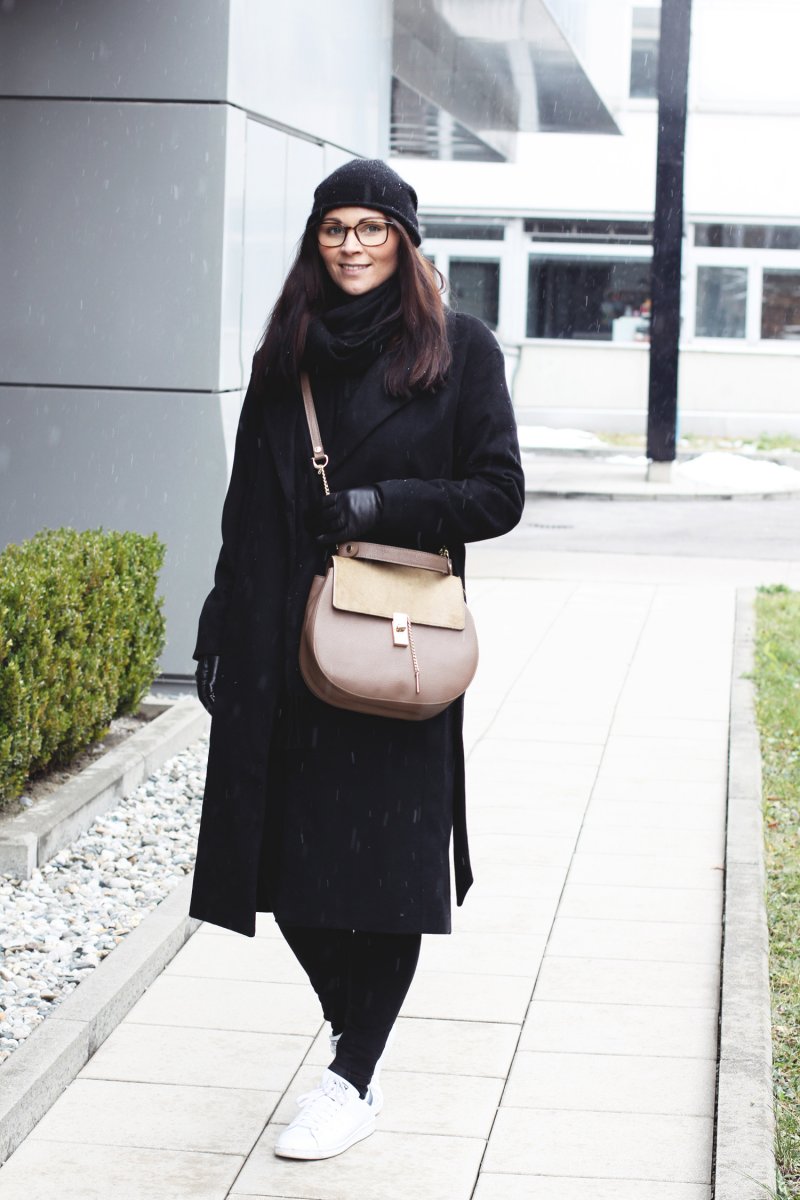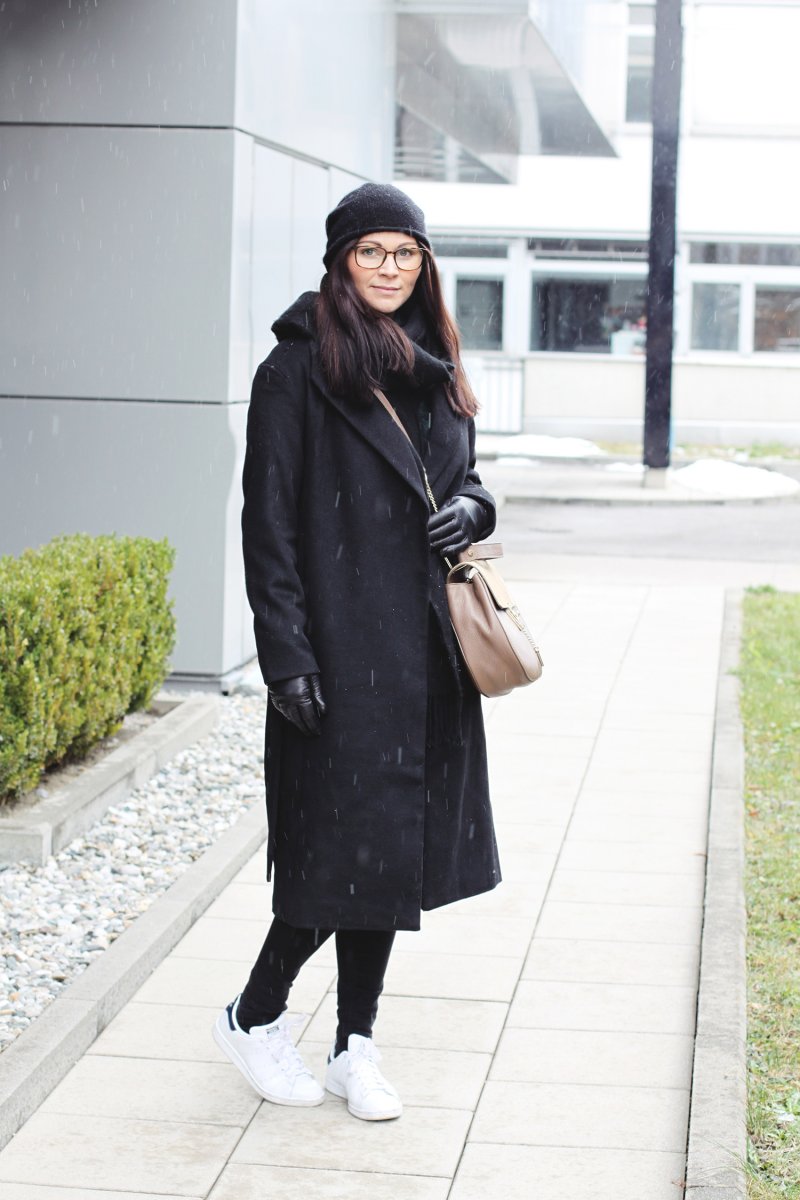 Den Mantel habe ich während des Black Friday Sals auf Zalando ergattert. Er kam ganze 30 % weniger zu diesem Zeitpunkt. Ein richtiges Schnäppchen also, das ich nicht ausschlagen konnte. Zum Glück, denn der Mantel ist super bequem und so warm. Zu dem langen schwarzen Wohlfühl-Mantel kombiniere ich meine geliebte Jamie Jeans von Topshop und meine weißen Stan Smith Sneakers. Für den ultimativen Wärmefaktor sorgen die Mütze von COS, die ich mittlerweile in 3 Farben besitze, der Topshop Schal und meine schwarzen Handschuhe von Roeckl.