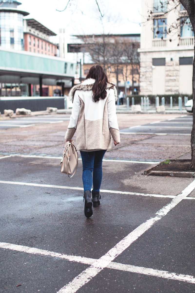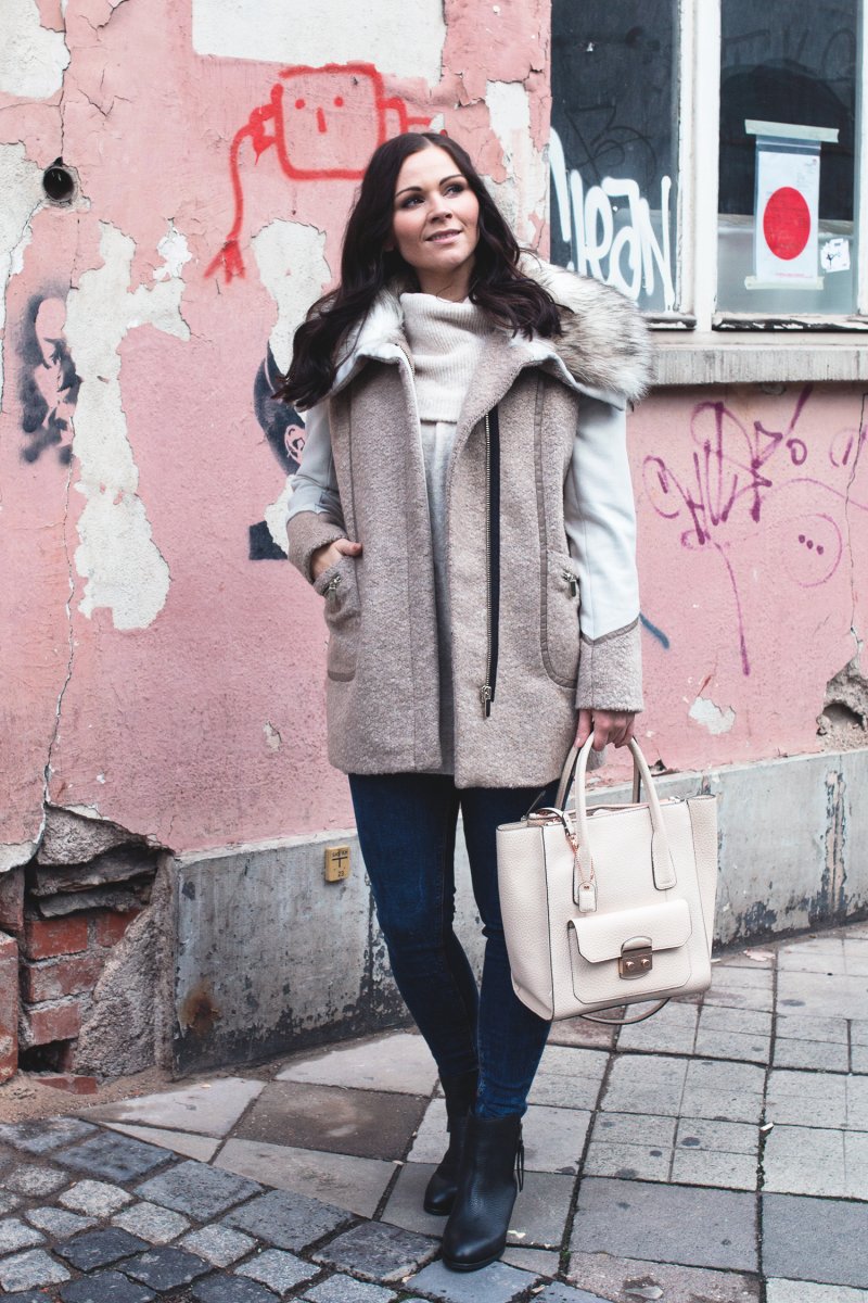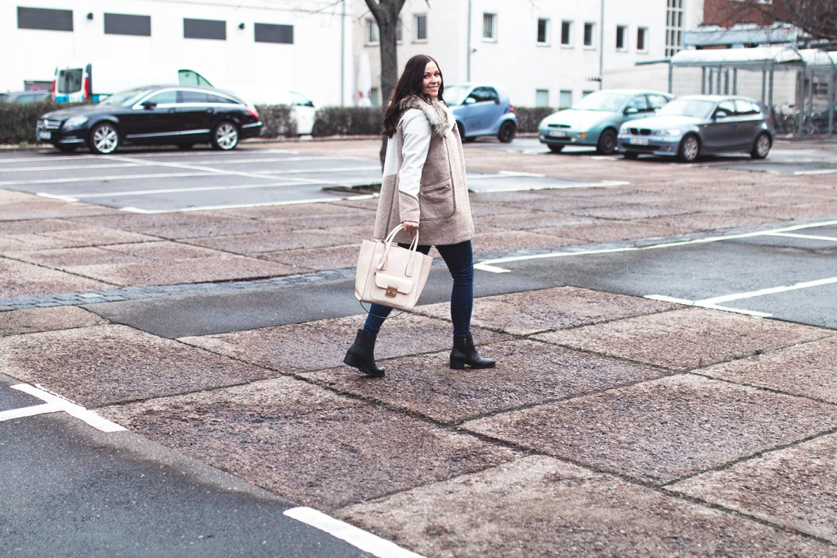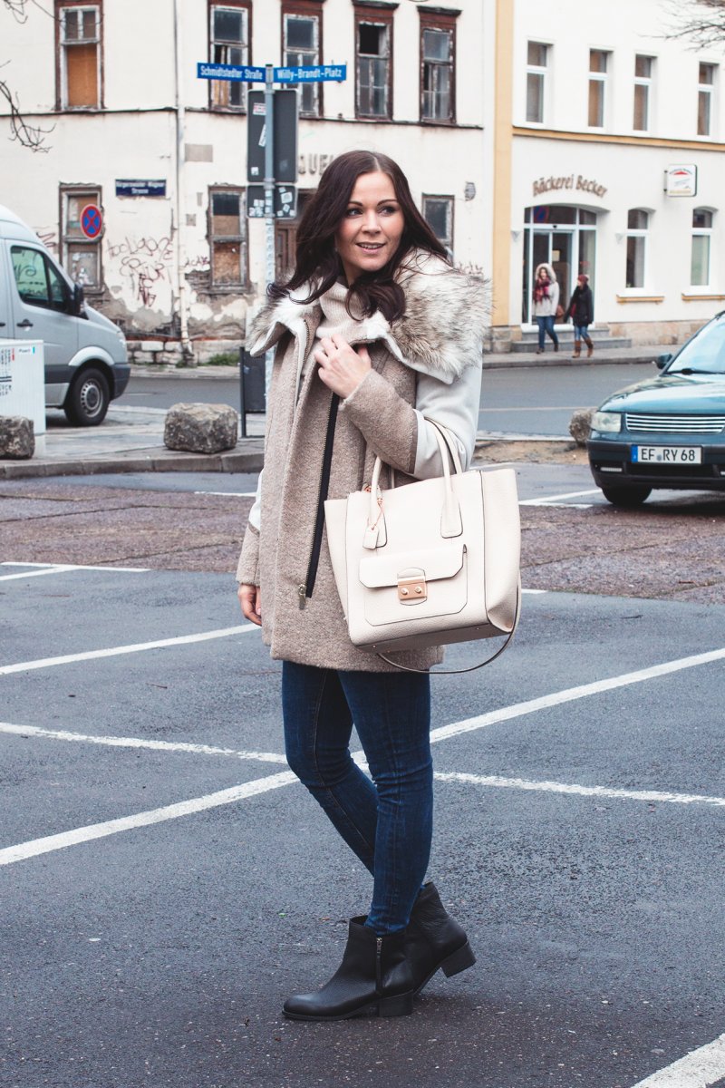 Zu dem Wintermantel trage ich eine blaue Jeans von Topshop und einen H&M Trend Pullover. Eigentlich trägt man diesen Pullover Off-Shoulder, aber ich habe ihn kurzerhand umfunktioniert – so lässt er sich auch super tragen. Um dem Outfit etwas Kontrast zu verleihen, setze ich an den Füßen auf schwarze Ankle Boots. So wirkt der Look gleich viel rockiger. Jetzt fehlt nur noch eine Handtasche, um den Look zu komplettieren. Ich entscheide mich für meine beige Tasche von Clarks, die ich euch schon in diesem Outfit gezeigt habe.