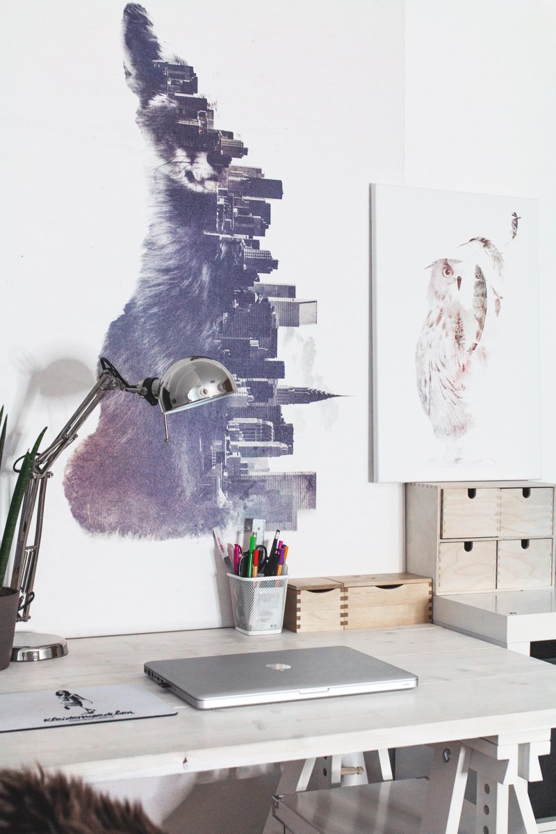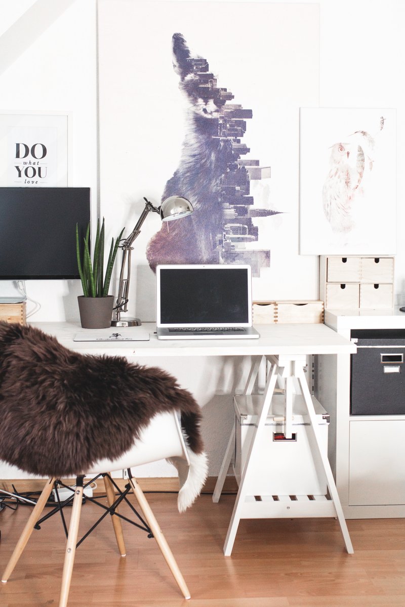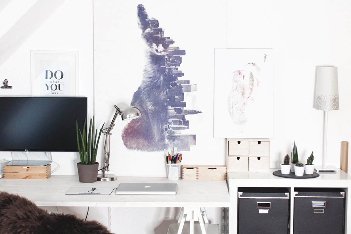 An meinem Arbeitsplatz soll es hell und freundlich sein. Deshalb habe ich mich für zwei sehr helle Leinwände mit Tiermotiven entschieden. Daneben hängt ein Bild mit dem Motto: „Do what you love“, das ich schon aus meinem DIY Schreibtisch selber bauen kennt.