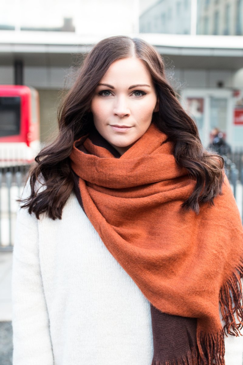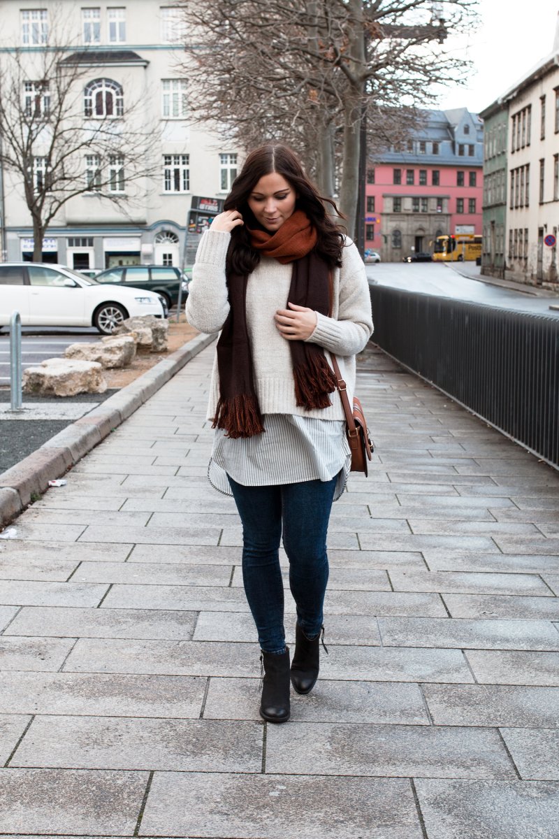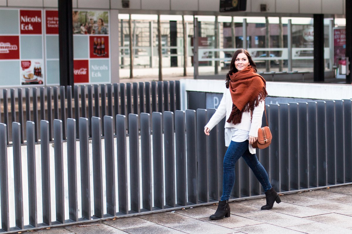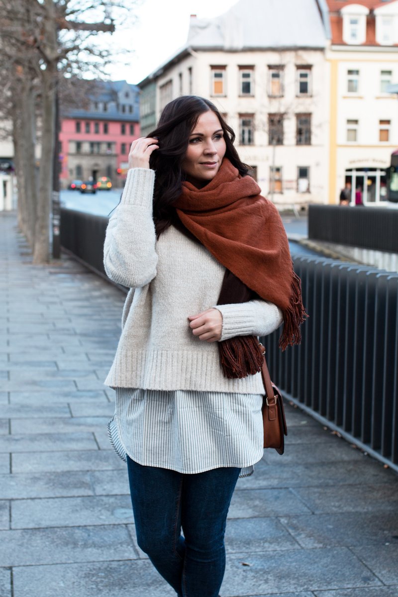 Ein richtig schönes Layering, und der Schal ist super undbildet einen tollen Kontrast zu den hellen Oberteilen 🙂