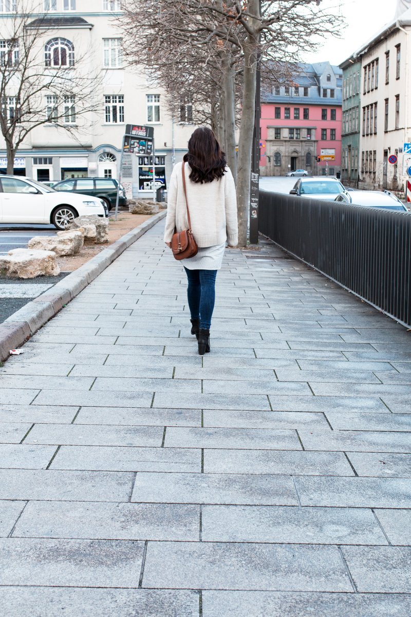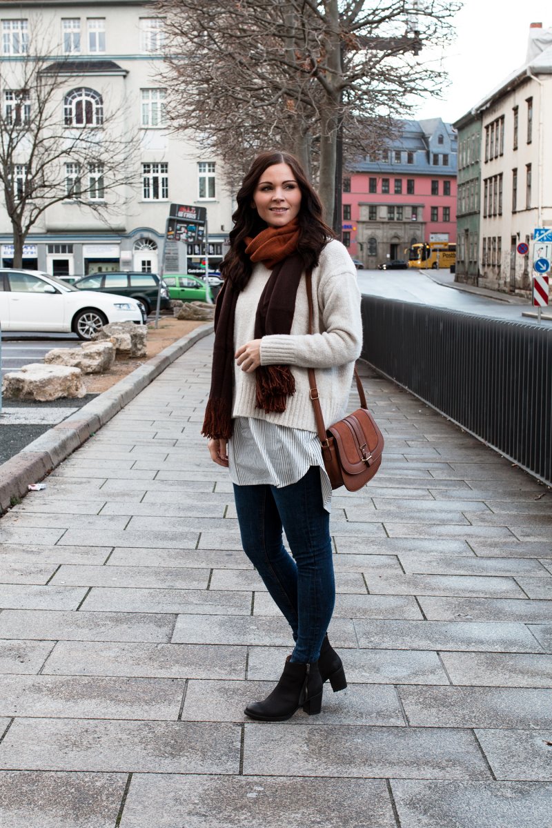 Im Winter wird gelayert um sich warmzuhalten. Genau das habe ich heute getan und eine Longbluse zu Strickpullover und Ankle Boots kombiniert.