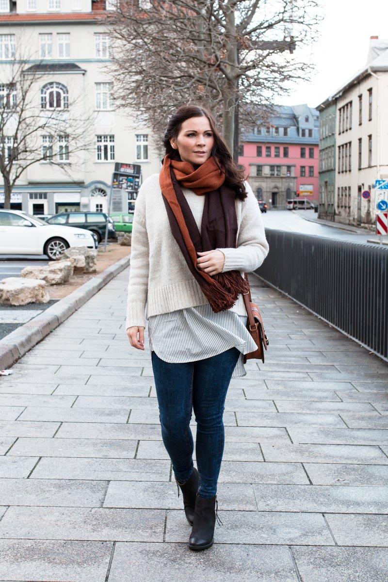 Outfit 2: Longbluse mit Strickpullover Layering und Zign Ankle Boots