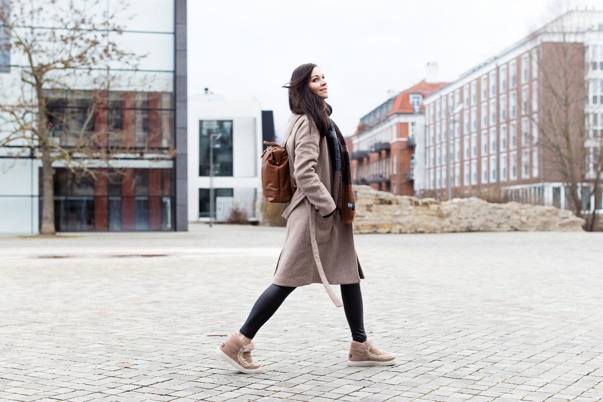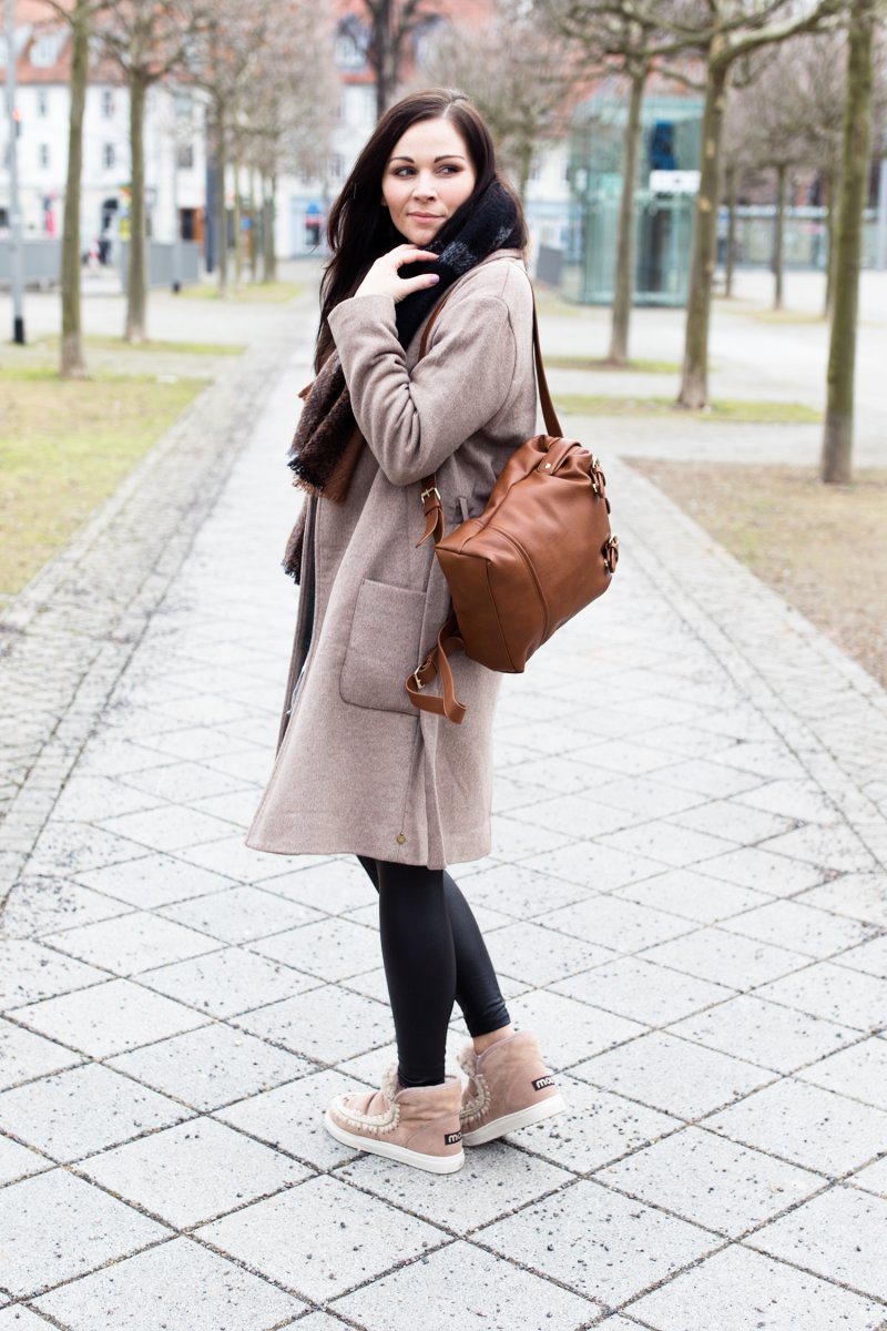 Das Outfit trug ich am Samstag, als wir uns auf dem Weg in die Stadt machten, um einen Kaffee trinken zu gehen. Obwohl das Wetter nicht so kalt war und momentan keine Spur von Minustemperaturen in Sicht ist, wehte ein eisiger Wind. Deshalb entschied ich mich für einen warmen Look mit Eskimo Boots und Wintermantel. Die Eskimo-Stiefel von Mou sind mit Lammfell gefüttert, das hält meine Füße superwarm. Zudem sind sie einfach superbequem an den Füßen, man fühlt sich in ihnen, als würde man auf Wolken schweben. Der Wintermantel greift die Farbe der Stiefel noch einmal auf und hält mich bei dem stürmischen Wetter superwarm.