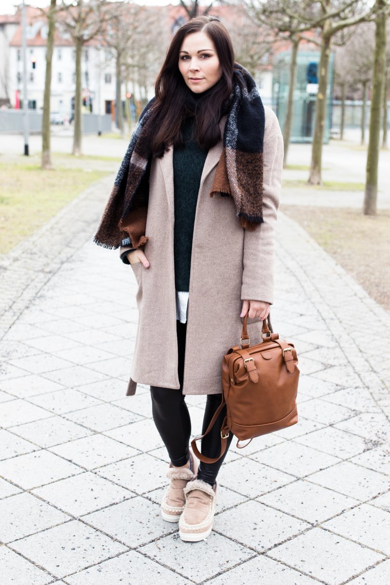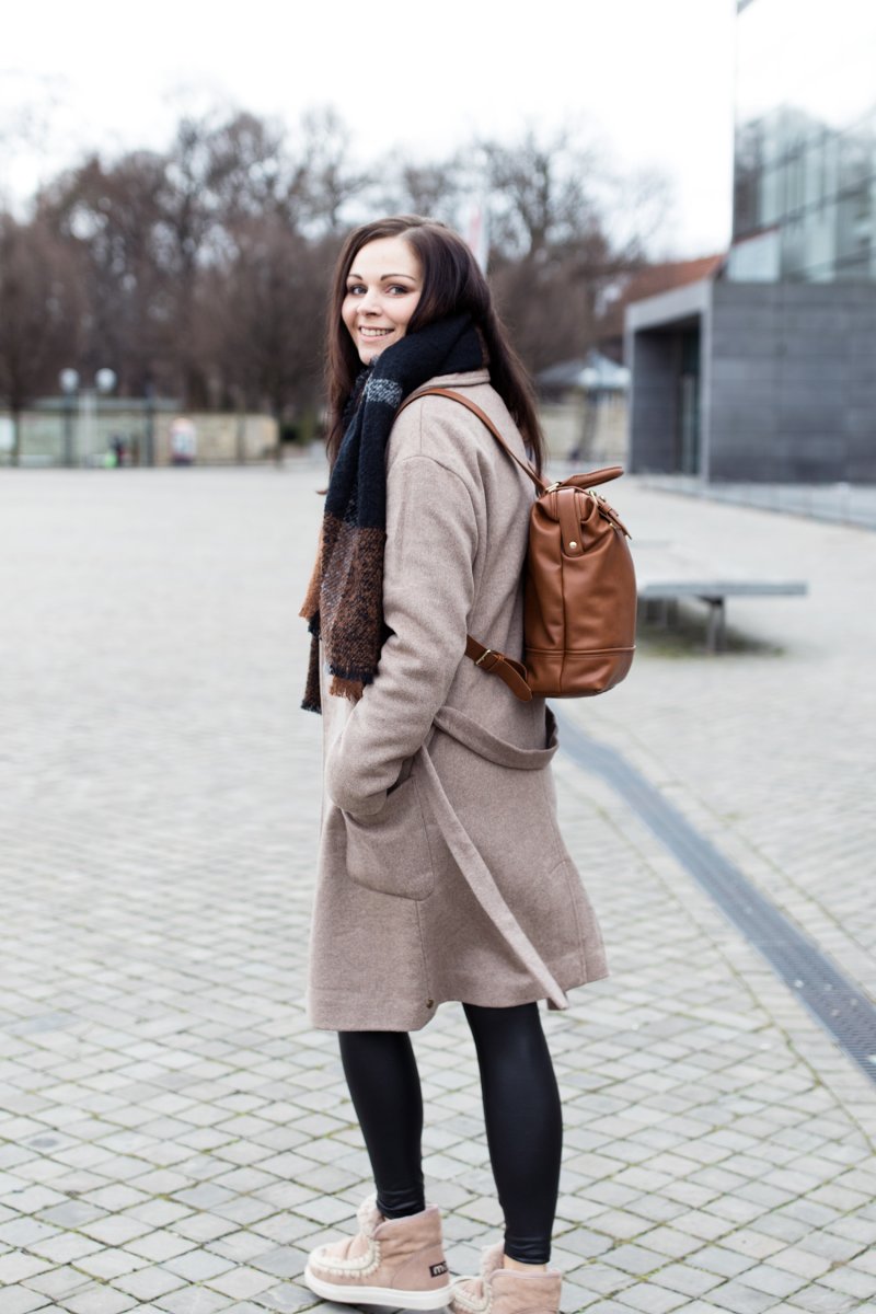 Ich mixe gerne unterschiedliche Materialien miteinander, wie bei diesem Outfit heute. Ich finde, das macht das Outfit noch viel lebendiger. In diesem Look kombiniere ich Kunstleder und Wolle miteinander. Ich bin ganz verrückt nach solchen Looks, auch deshalb, weil sie sich so vielfältig kombinierbar sind. Meine erste Wahl fällt da immer auf meine gemütliche Lederleggings von Vila. Das zweite Lederaccessoires ist mein Rucksack von Mint&Berry, der den Look sehr gut abrundet und das warme braun des Schals noch einmal aufgreift.