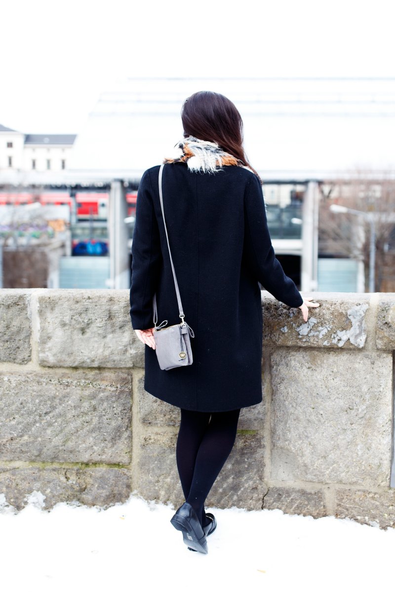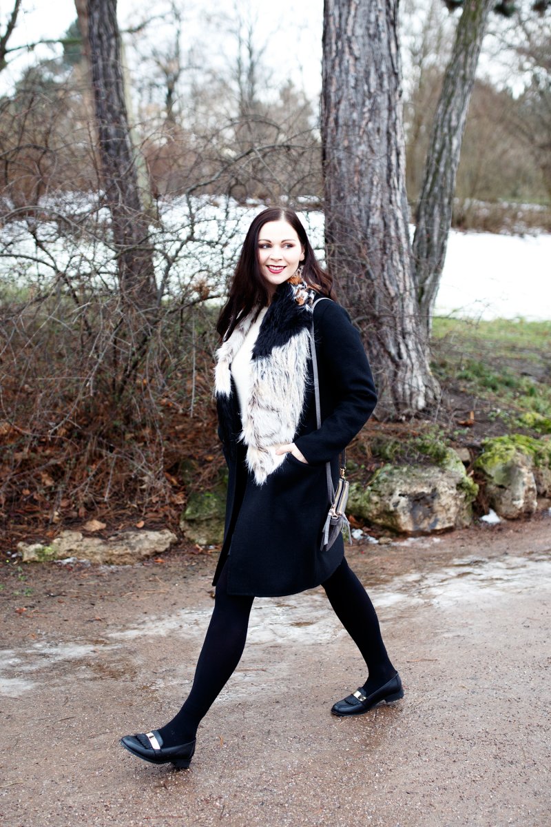 An den wärmeren Wintertagen, greife ich gerne zum Rock. Am liebsten kombiniere ich das elegante Stück mit blickdichten Strumpfhosen und Slippern an den Füßen. So wie in meinem heutigen Outfit. Ich trage einen schwarzen Rock von Kookai und dazu elegante Slipper von as0s, diese habe ich letztes Jahr im Frühling ergattert. Dazu kombiniere ich einen dicken Stickpullover und meinen schwarzen Wintermantel von Zara. Als Eyecatcher trage ich einen Schal aus Kunstfell von River Island und eine graue Tasche von Oasis.
