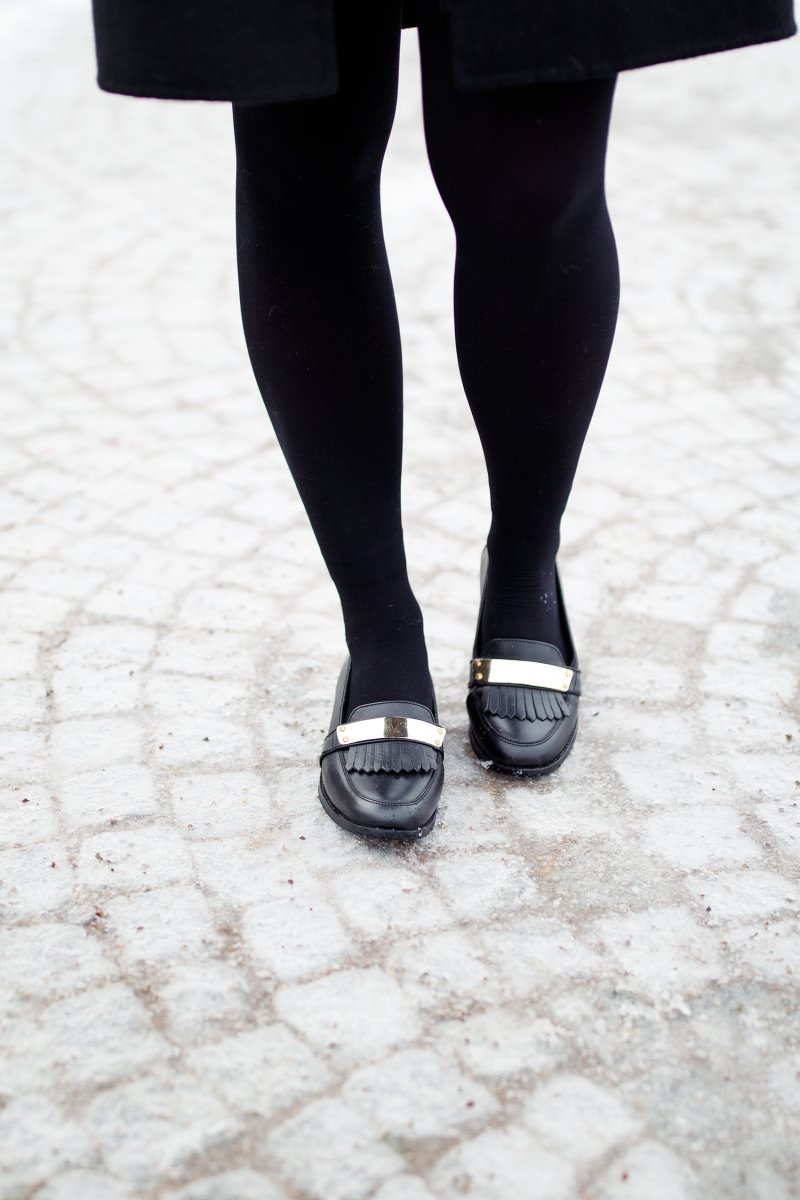 Meinen braunen Wintermantel von Zara kennt ihr bereits, ich habe ihn euch in vielen Outfits vorgestellt. Unter andrem in meinem Cityoutfit und in meinem Rebecca Minkoff Look. Dasselbe Modell habe ich seit einiger Zeit auch in Schwarz an meinem Garderobenständer hängen. Natürlich möchte ich euch den Mantel nicht vorenthalten und zeige ihn euch heute in einer eleganten Outfitkombination. Ich präsentiere euch ein Outfit mit schwarzem Zara Mantel, asos Slipper und Kookai Rock.