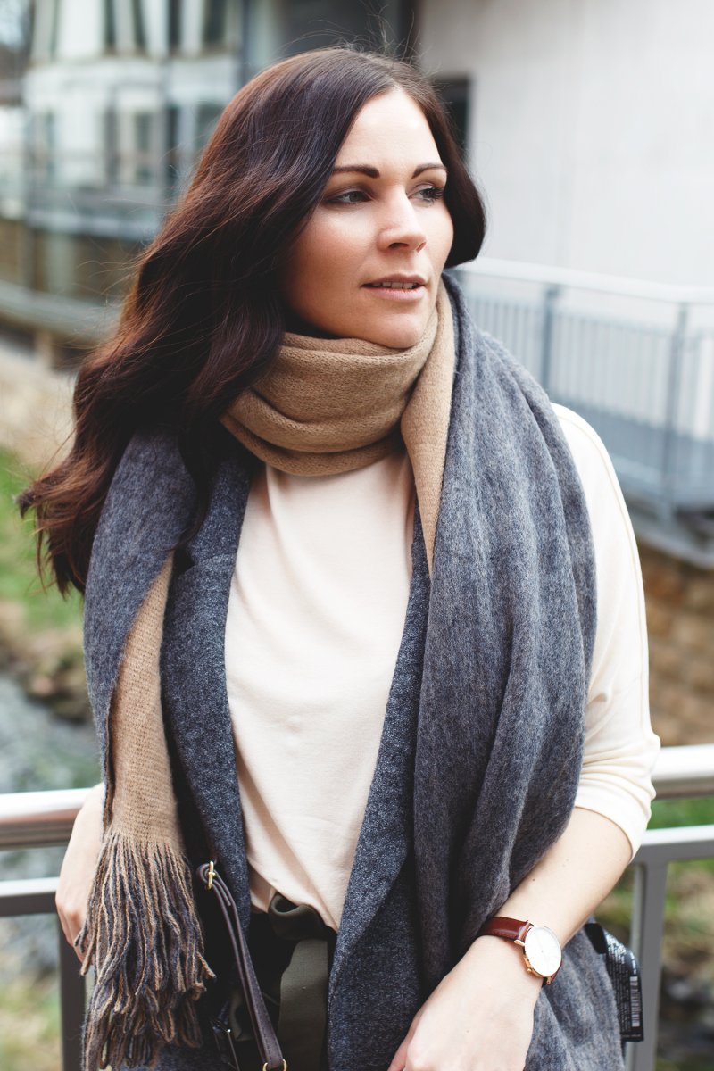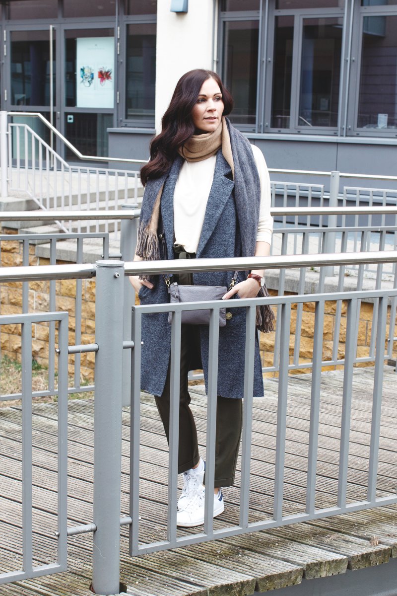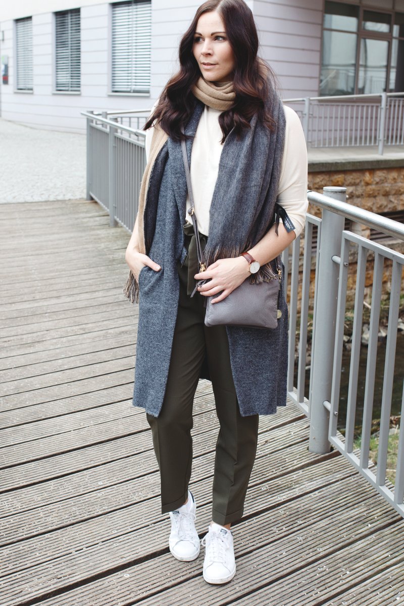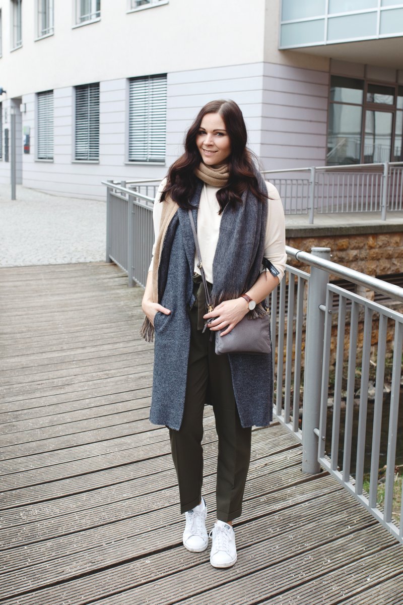 Today I layer with a pastel yellow basic shirt from Asos and a Zara scarf. I combine it with my lovely Zara vest and with loose fit trousers, I have found by Asos too. The highlight on my spring outfit are the stand smith sneakers by Adidas. These shoes are perfect for the upcoming spring season. I’m pleased showing you the shoes in many different outfit styles.