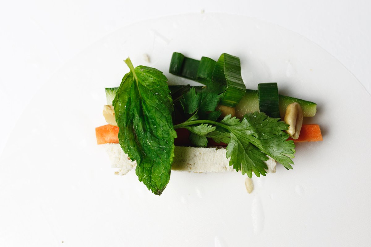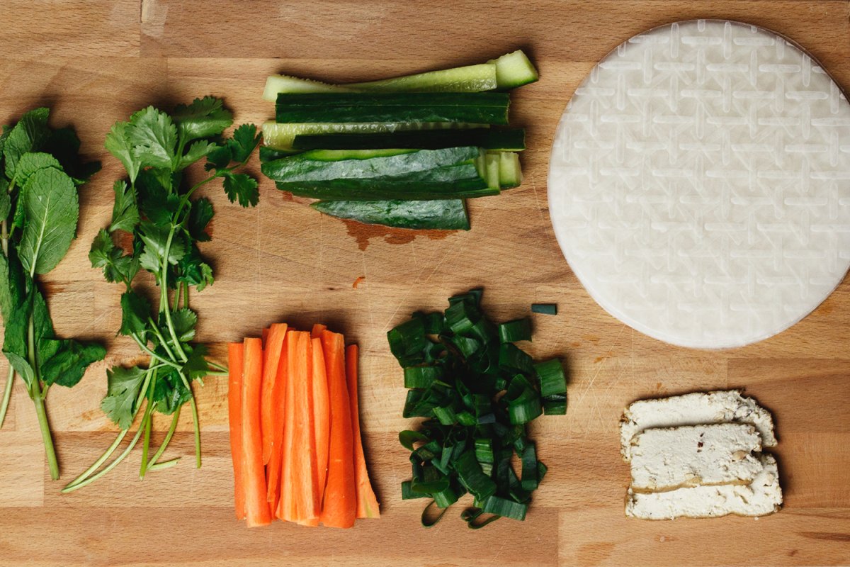 - Schneidet Gurken, Möhren und Tofu in dünne Streifen und pflügt von Minze und Koriander die Blätter ab.