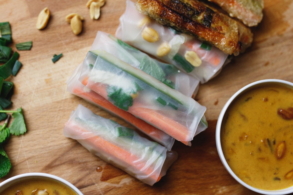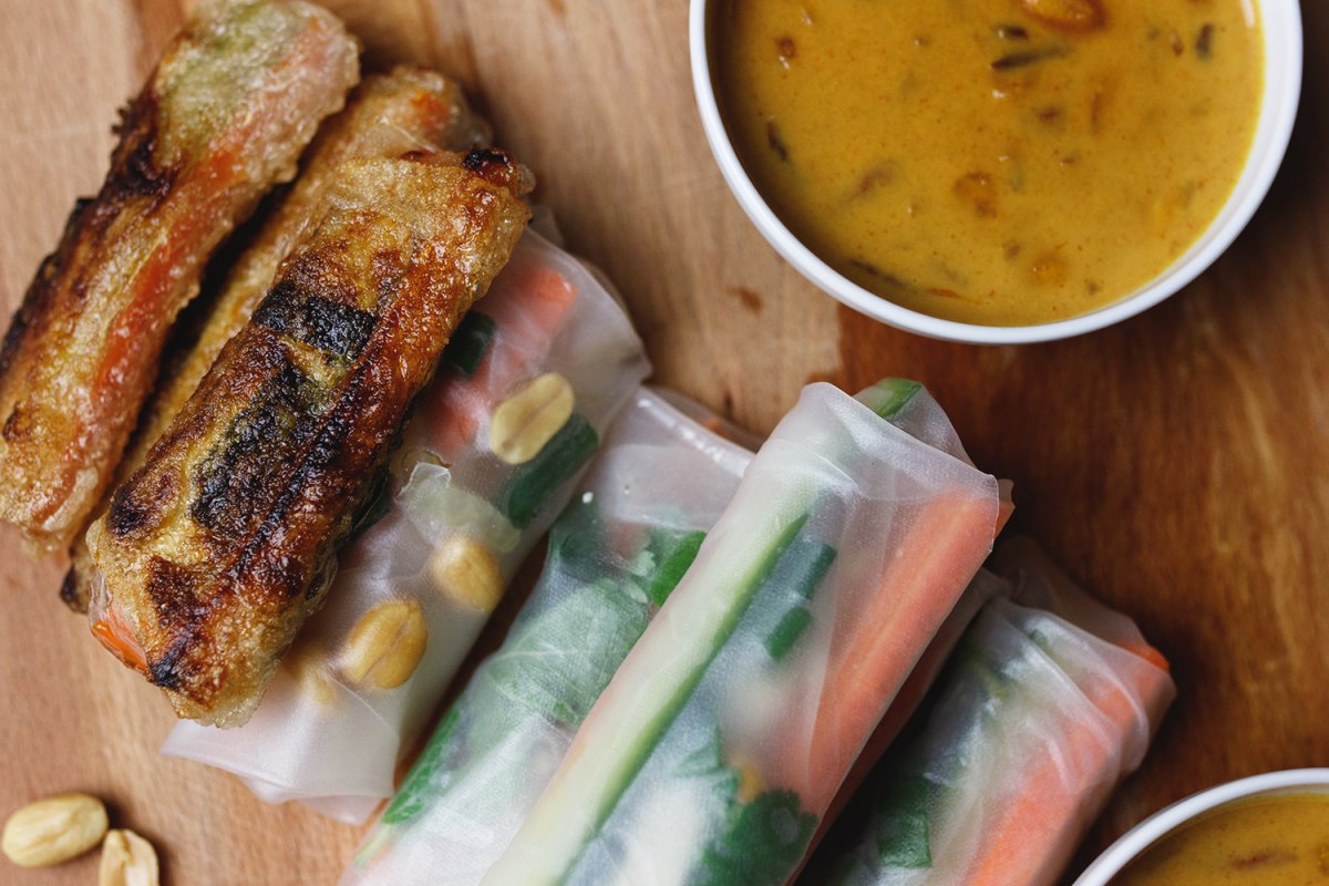 Vegane Sommer Rollen mit Erdnusssauce auf zweierlei Art