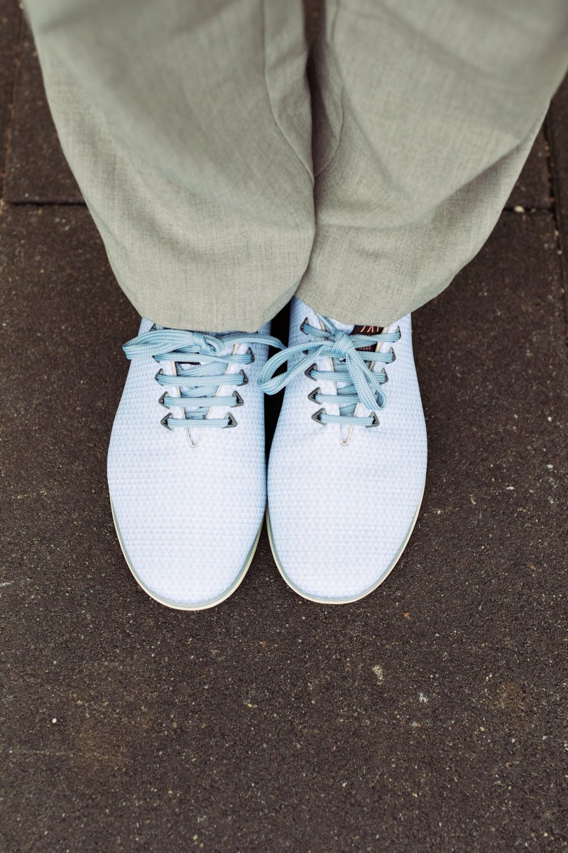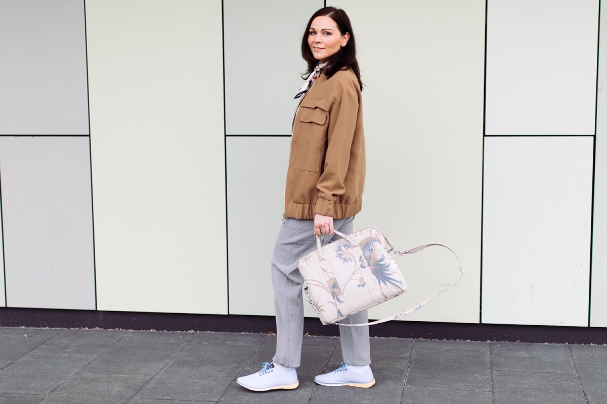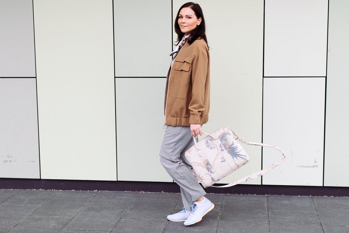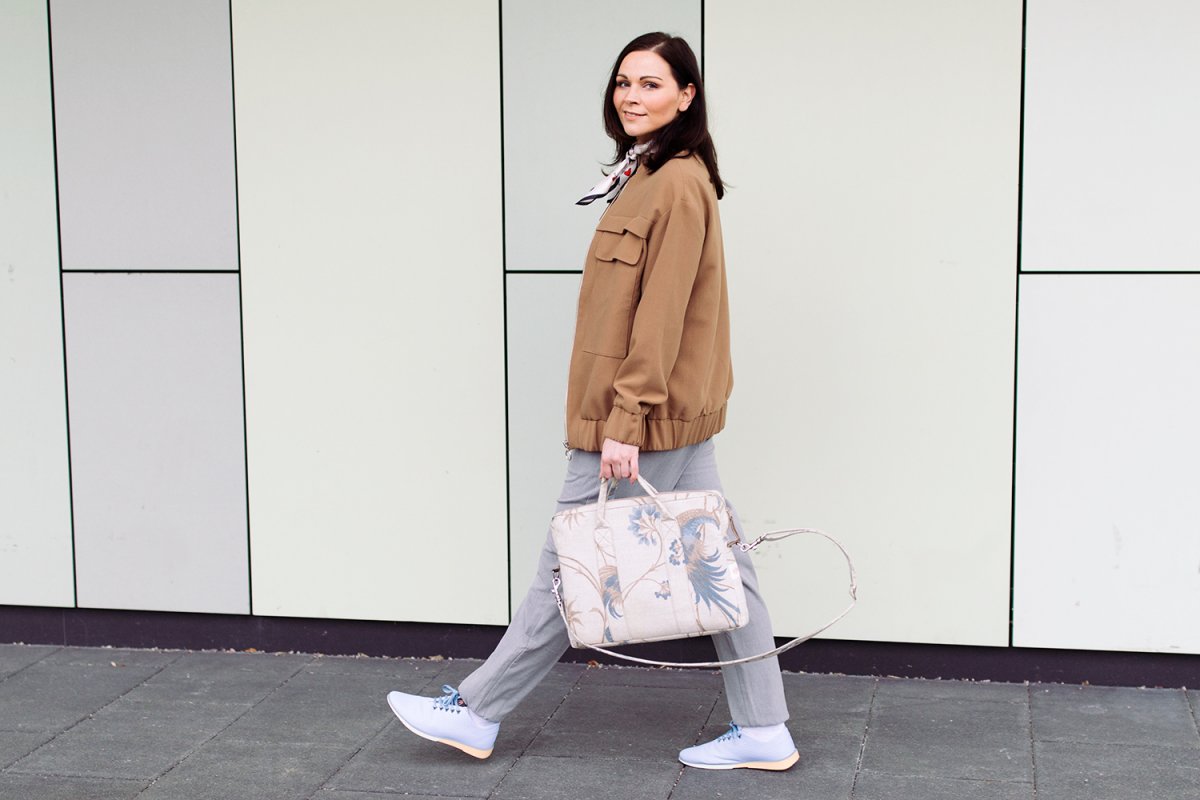 Zur Bomberjacke trage ich ein graues Basic Shirt mit langen Ärmeln und eine graue Hose. Die beiden Teile unterscheiden sich farblich kaum voneinander, höchstens um eine Farbnuance. An den Füßen greife ich zu der Pantone Trendfarbe Serenity und trage lässige Sneakers in einem Babyblau.