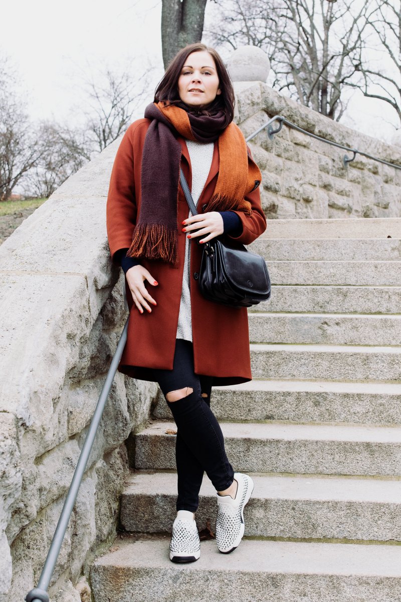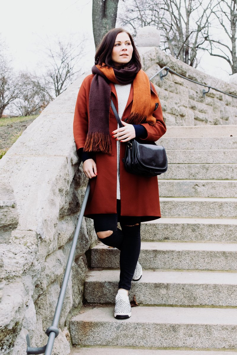 Mein heutiges Outfit ist eine farbenfrohe Mischung aus Frühling und Winter. Ich kombiniere einen Zara Mantel in Marsala zu dunkelblauem Rollkragenpullover und grau meliertem Pullover. Dazu trage ich eine schwarze Jeans, dicken Wollschal und meine geliebte Maxwell Scott Tasche, diese kennt ihr ja schon aus meinem letzten Frühlingsoutfit. An den Füßen setze ich funkelnde Akzente und trage die Shine Baby Shine Sneakers von Pinko.