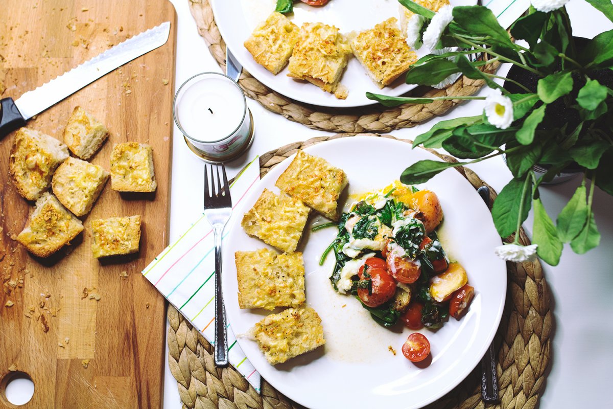 Ostern steht vor der Tür. Für alle die noch nicht so recht wissen, was sie zu Ostern auf den Tisch zaubern möchten, habe ich ein etwas anderes Ostergericht. Ein vegetarisches Gericht mit Knoblauchbrot und gebackenem Spinat-Curry. Wie ihr wisst, liebe ich Speisen, die nicht schwer im Magen liegen und die ich auch zwischendurch genießen kann. Das Knoblauchbrot ist da eine super Alternative. Es ist die perfekte Basis zum Snacken und schmeckt auch noch 2 Tage später ofenfrisch. Ergänzt wird das Ganze mit einer Extraportion Vitamine. Diese decke ich mit dem Spinat-Curry locker ab. Das Curry ist supersaftig und zergeht förmlich auf der Zunge. Wie ihr das gebackene Spinat-Curry mit Knoblauchbrot zubereitet, zeige ich euch jetzt: