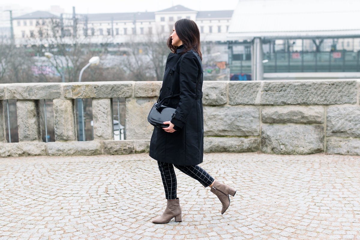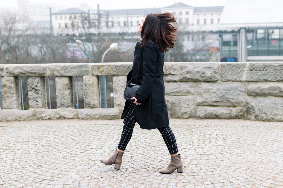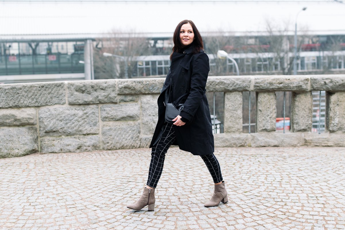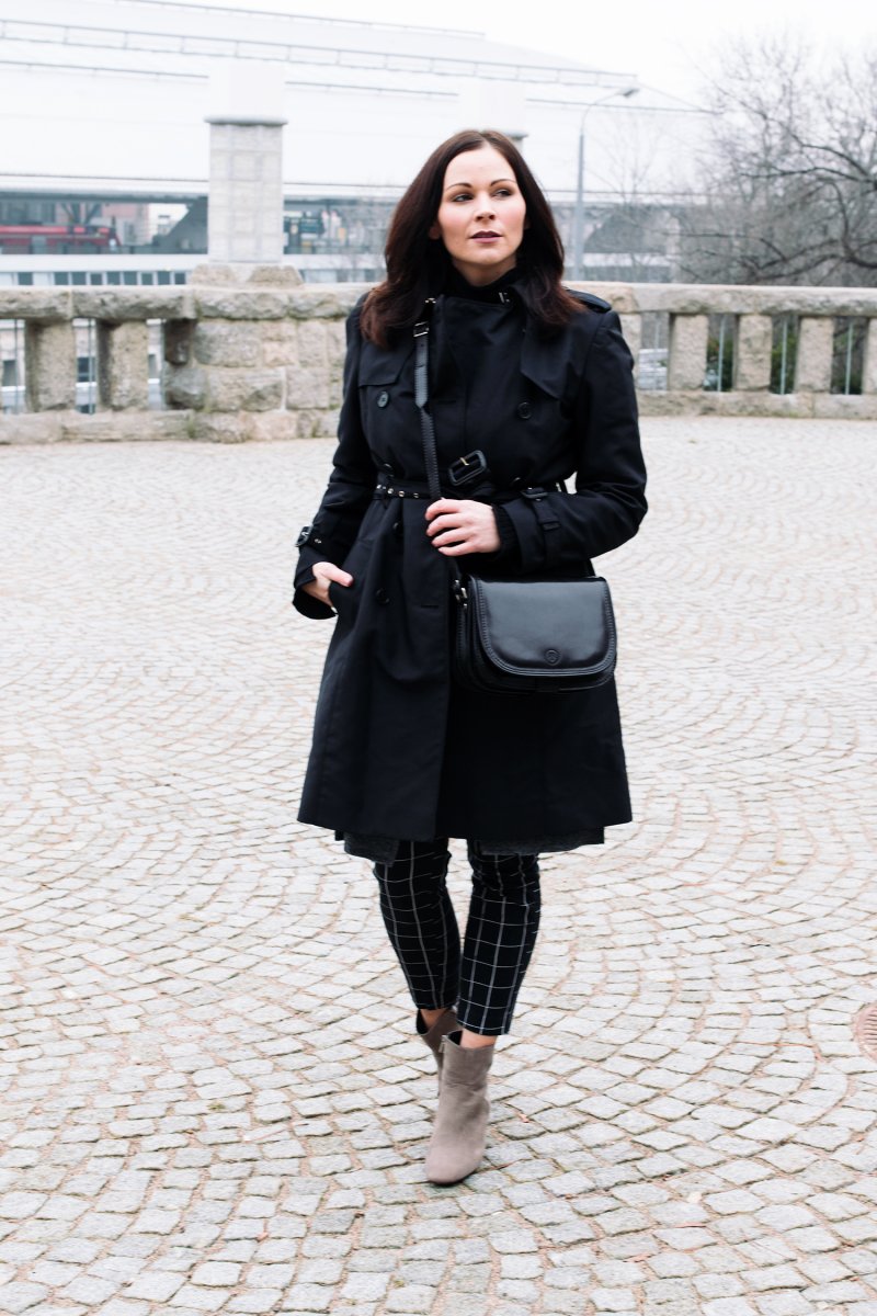 Zu dem schwarzen Trenchcoat kombiniere ich einen ebenfalls schwarzen Rollkragenpullover, eine graue Weste und meine geliebte Karohose in Schwarzweiß. Wer meinen Modeblog schon länger liest, weiß das ich sehr gerne diese Art von All Black Looks trage, in denen ein kleiner Farbspritzer versteckt ist. Für ein wenig Farbvariation in meinem heutigen Outfit sorgen die taubfarbenen Stiefeletten. Die sehen nicht nur superschön aus, sondern sind auch noch sehr bequem. Abgerundet wird meine heutiges Outfit mit der schwarzen Umhängetasche von Maxwell Scott, die ich euch bereits im letzten Outfit mit Nike Air Max Thea vorgestellt habe.