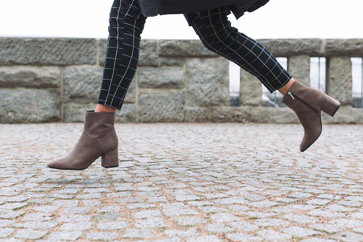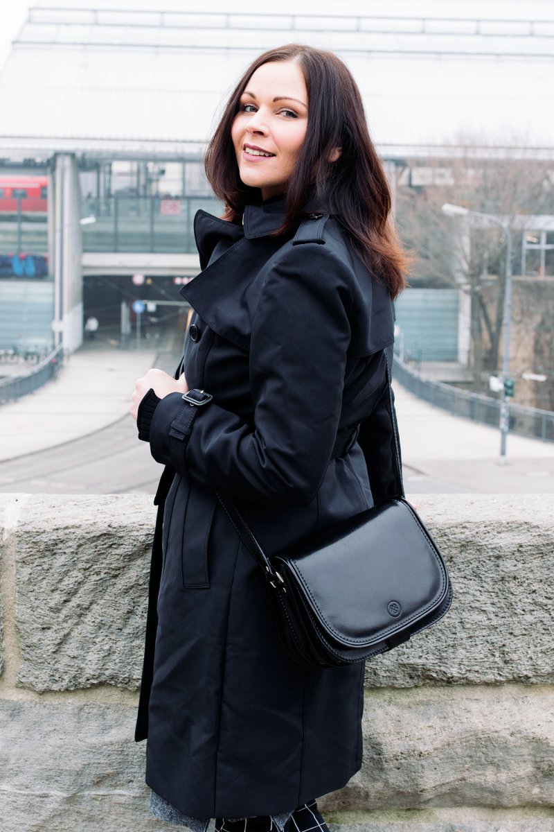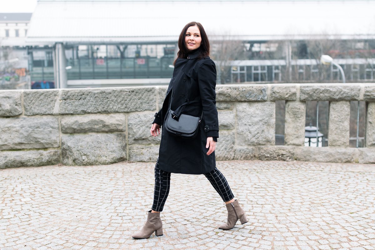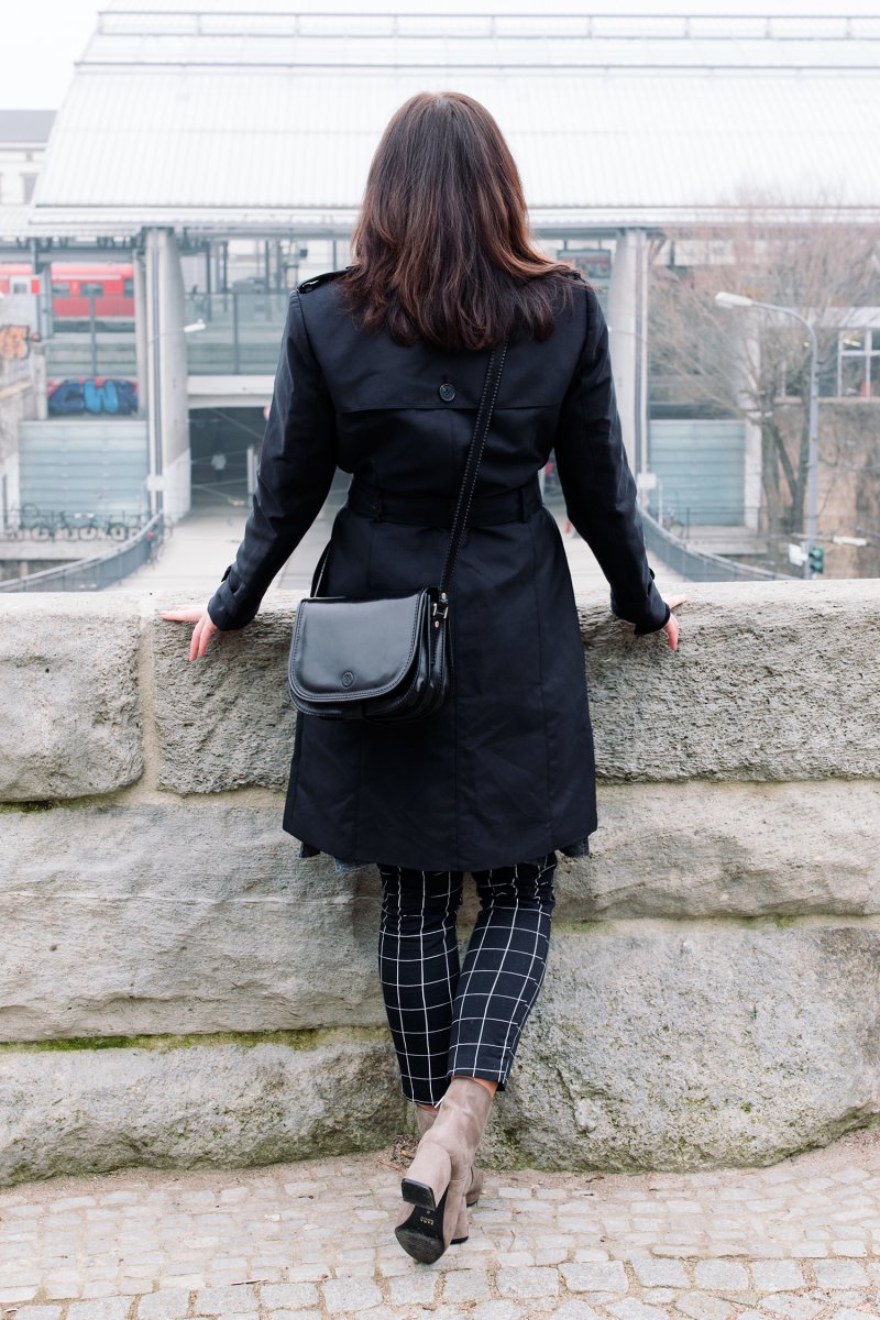 Zu dem schwarzen Trenchcoat kombiniere ich einen ebenfalls schwarzen Rollkragenpullover, eine graue Weste und meine geliebte Karohose in Schwarzweiß. Wer meinen Modeblog schon länger liest, weiß das ich sehr gerne diese Art von All Black Looks trage, in denen ein kleiner Farbspritzer versteckt ist. Für ein wenig Farbvariation in meinem heutigen Outfit sorgen die taubfarbenen Stiefeletten. Die sehen nicht nur superschön aus, sondern sind auch noch sehr bequem. Abgerundet wird meine heutiges Outfit mit der schwarzen Umhängetasche von Maxwell Scott, die ich euch bereits im letzten Outfit mit Nike Air Max Thea vorgestellt habe.