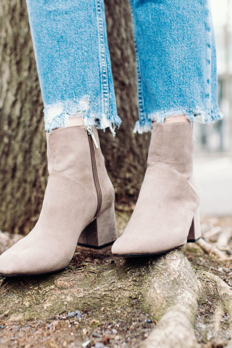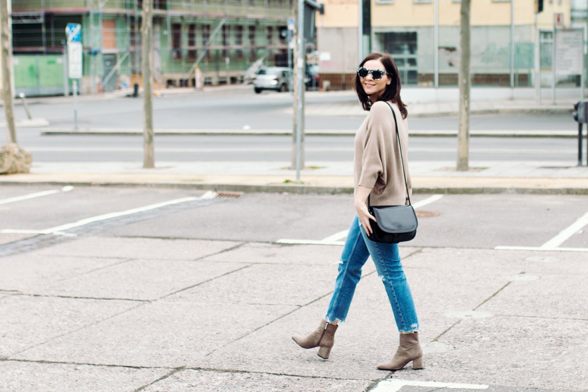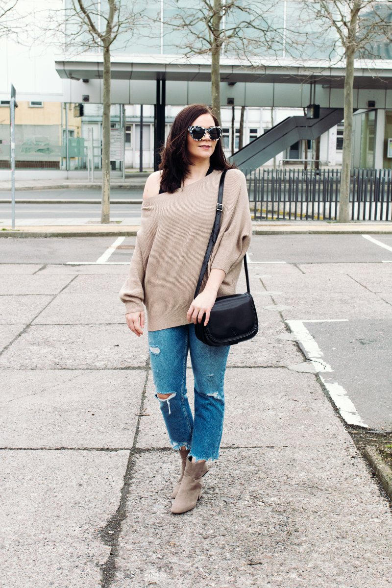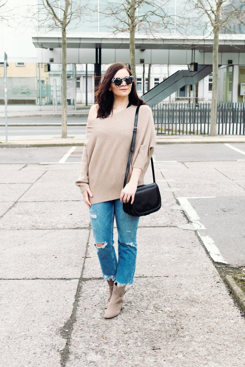 My today’s outfit is a combination between cozy and elegant. I style frayed jeans to an off-shoulder jumper and a black body. I like the combination because it is perfect for the spring season not too cold and not to warm. On my feet I wearing comfy boots in a great taupe color. The same color as my oversize jumper.