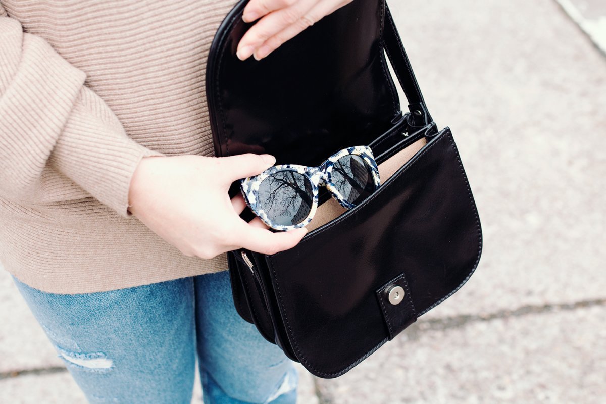 Every spring I need a new sunglasses. My current model bought by H&M. I like the shape of the sunglasses and also the great print, too. Lastly, I will show you my black bag from Maxwell Scott. I like the bag so much and wear it all the time.