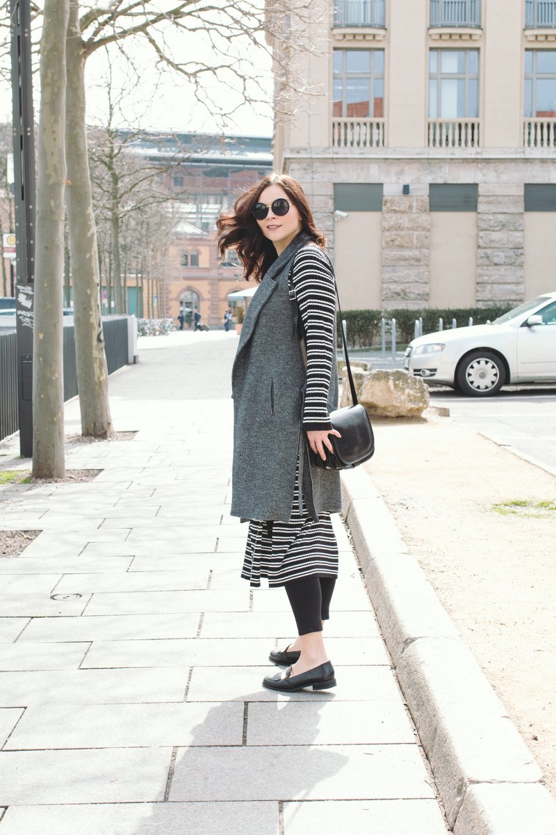 Zum Glück hat mich der Wettergott erhört und ich reiste mit dem Frühlingswetter im Gepäck nach Erfurt zurück. Bereits einen Tag später kam auch hier das großartige Sonnenwetter an und meine Laune stieg trotz Erkältung kerzengerade in die Höhe. Ich brauchte nur 5 Minuten um mich anzuziehen und an die frische Luft zu sprinten, den Look, den ich an diesem Tag getragen habe, habe ich auch prompt für euch abgelichtet. Ich trage ein langes gestreiftes Maxikleid zu einer schwarzen Jeans. An den Füßen geht es luftig zu, endlich kann man wieder ohne zu frieren offene Schuhe tragen. Auf der Nase habe ich mich für eine runde Sonnenbrille entschieden, diese Modelle finde ich gerade superchic und überlege mir schon weitere Modelle anzuschaffen. Aber da ich ja bald umziehe und mein Hab und Gut eher reduzieren möchte, habe ich mir eine Kaufbremse gesetzt, bis wir in die neue Wohnung umgezogen sind.