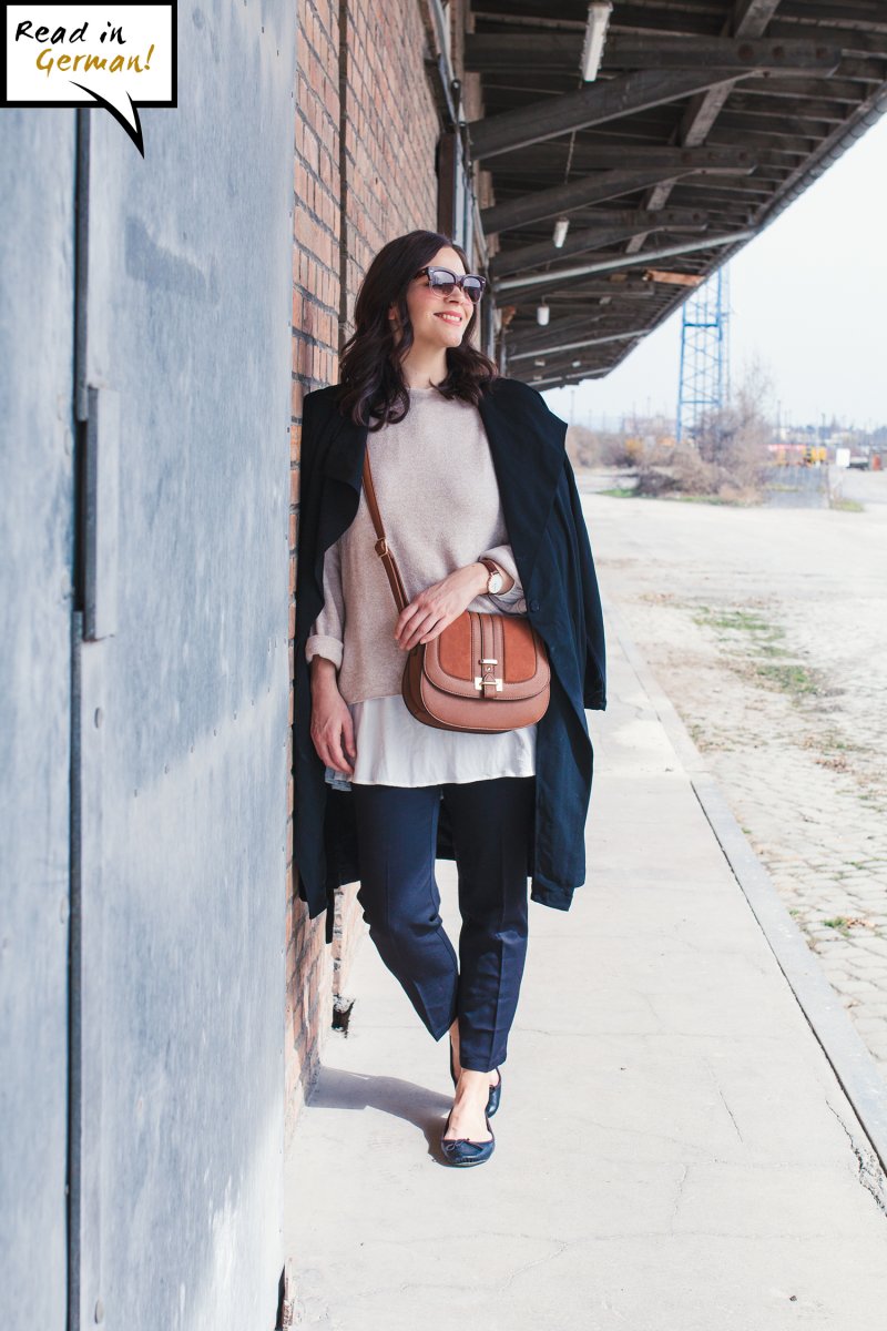 In my today’s outfit, I combine a black trenchcoat to cozy trousers likewise in black. I love to style outfits with big contrasts, so I choose to style a white dress and a beige jumper to the outfit. It is a perfect example of a layering style, which I love to wear in spring too. On my feet I wear ballerinas, there are so comfy and round off the trenchcoat style.