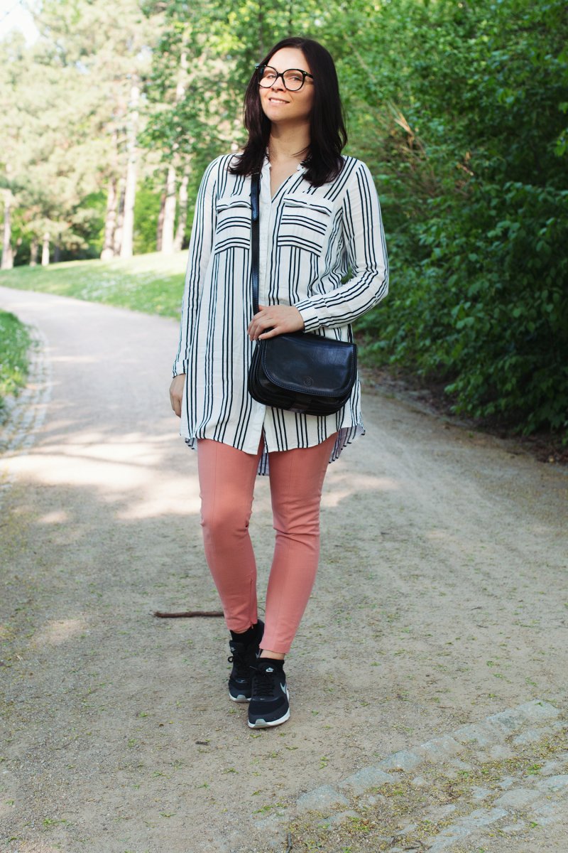 Mein heutiger Look ist eine Mischung aus sportlich und elegant. Dieses Outfit habe ich am Sonntag getragen, als wir Lillie abgeholt haben. Eine Outfitkombination, die ich sehr gerne im Alltag trage. Ich kombiniere meine neue Marc Jacobs Brille zu Nike Sneakers. Vom Stil her sind beide Teile sehr unterschiedlich, aber dennoch haben sie eins gemeinsam: sie sind Schwarz. Schwarz setzt in meinem heutigen Look die Akzente und ist ein schöner Kontrast zu den hellen und sanften Frühlingstönen der Hose und der Bluse.