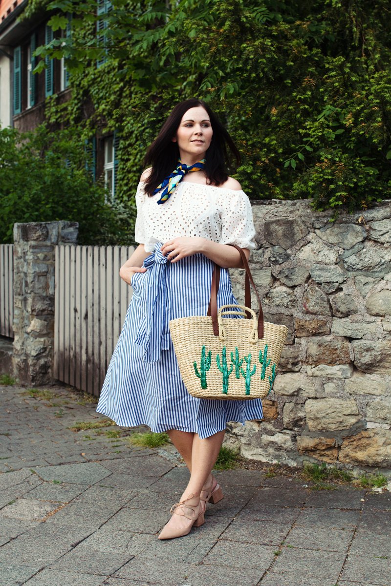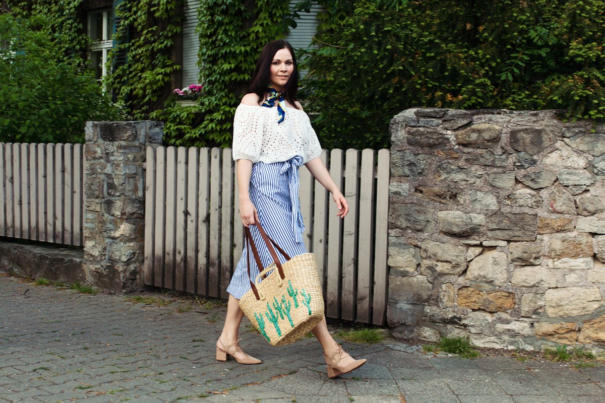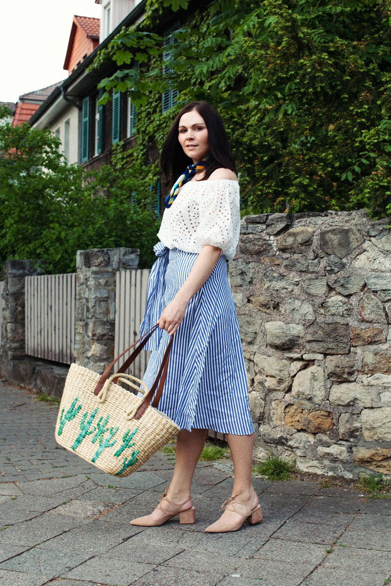 Am Wochenende nahm ich das schöne Wetter zum Anlass und verabredete mich auf einen Kaffee in der Stadt. Solche Auszeiten sind momentan selten geworden, denn wir sind immer noch in jeder freien Minute mit unserer Wohnung beschäftigt. Es hat gut getan, einfach mal wieder abzuschalten und für zwei Stunden die Seele baumeln zu lassen. Dafür habe ich mich dann auch richtig in Schale geworfen und ein Outfit mit gestreiftem Midirock, Strandtasche und Off-Shoulder Top gewählt.