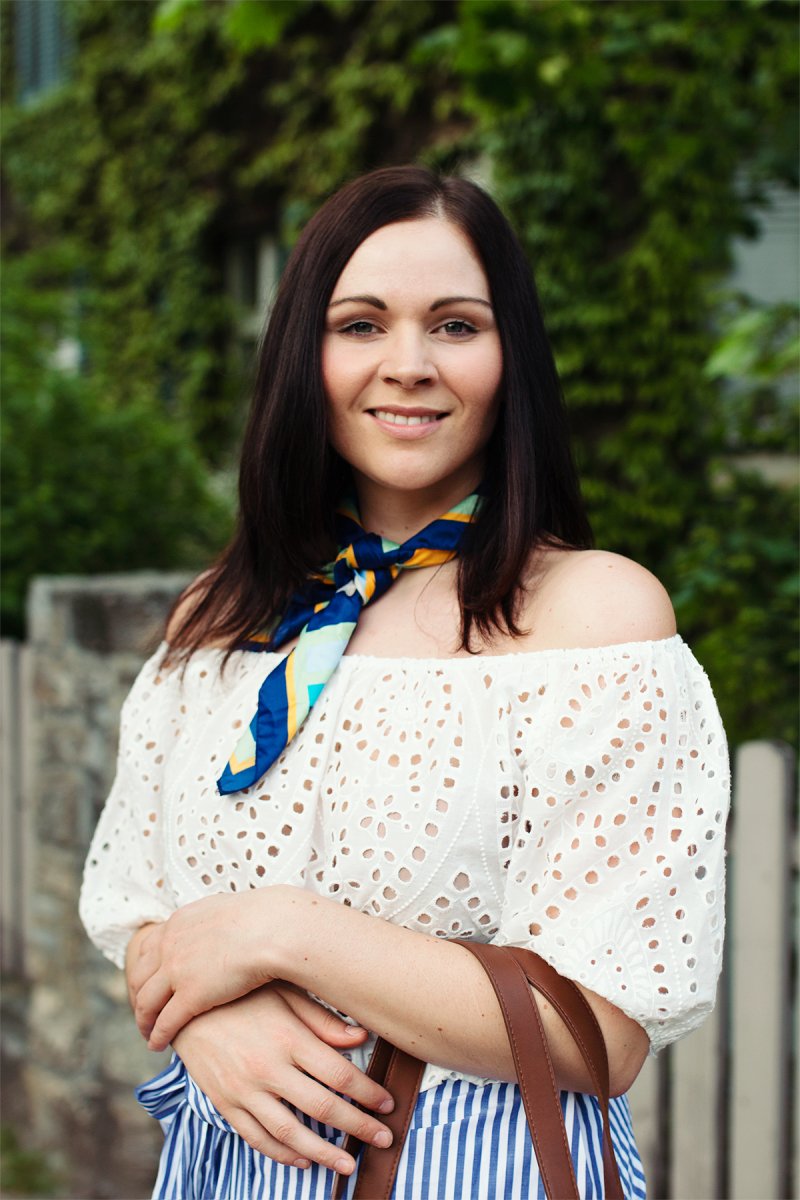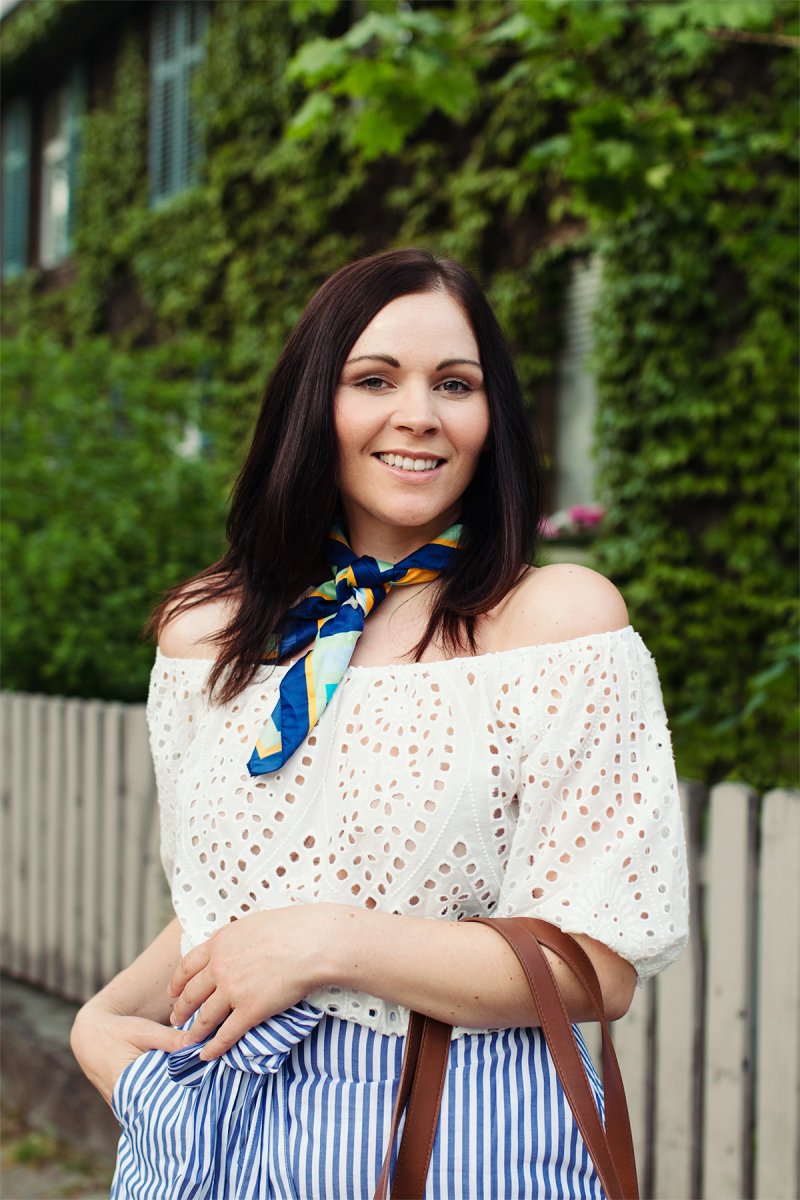 Das sommerliche Outfit enthält 3 meiner Fashion Trends für diesen Frühling, die wie ihr seht auch sehr gut im Sommer funktionieren. Ich kombiniere Off-Shoulder Top zu Lace-Up Sandalen und Halstuch. Dazu trage ich einen weiteren Favoriten spazieren, einen Midirock in Streifenoptik. So gesehen ist der Rock gleich ein doppelter Favorit. Wer meinen Blog schon länger verfolgt, weiß das ich Streifen über alles Liebe ebenso wie Midiröcke. Perfekt, wenn man zwei Trends in einem Teil unterbringen kann, da freut sich auch der Geldbeutel.