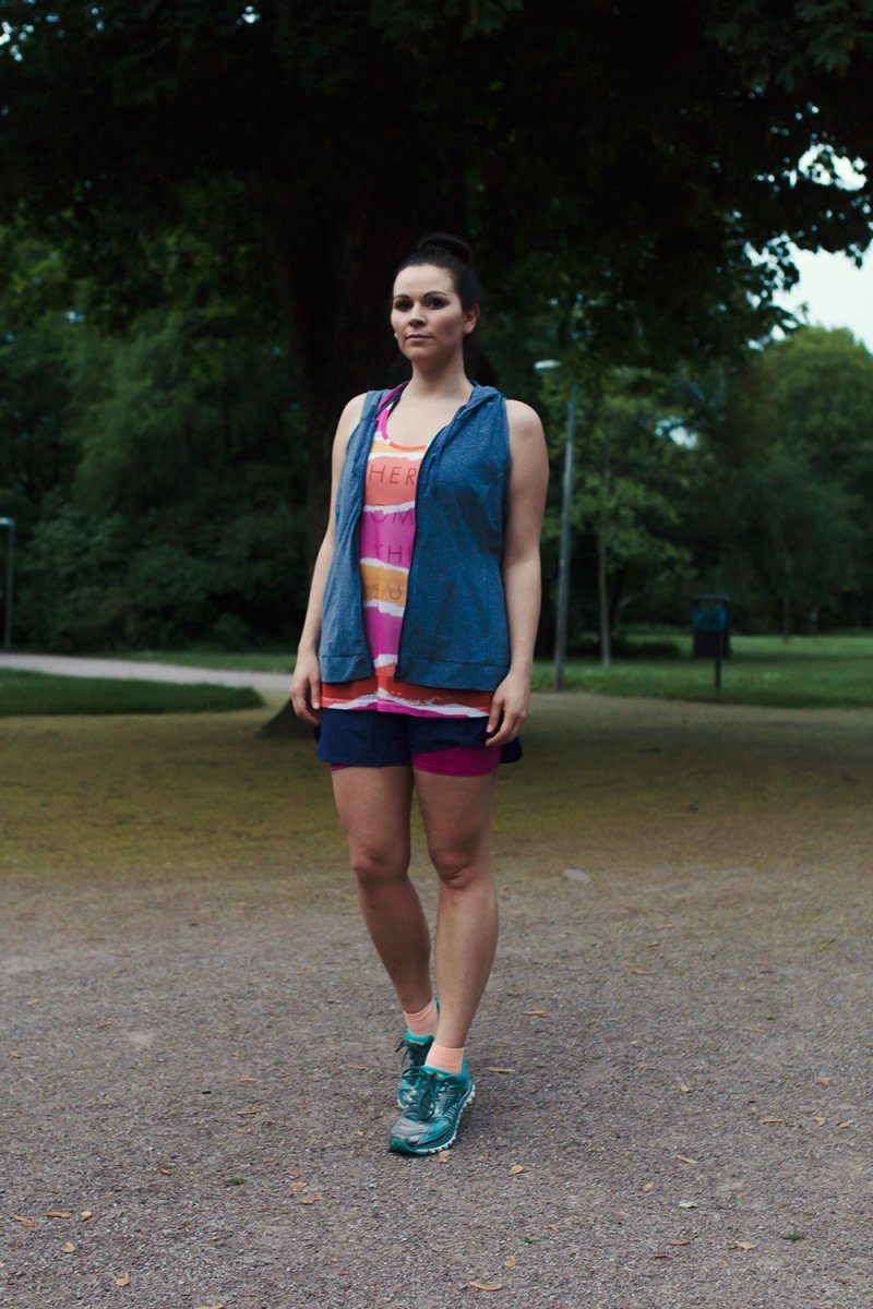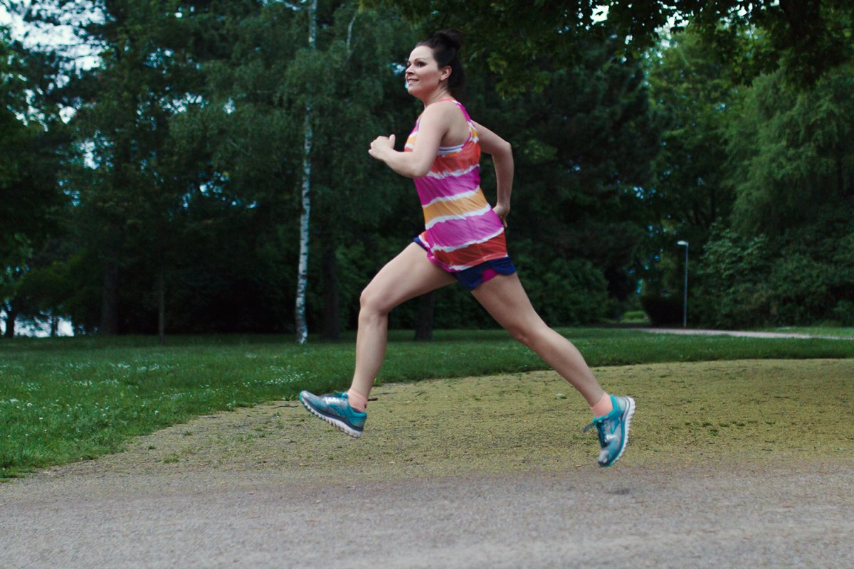 Der zweite Look ist ein Poweroutfit zum Laufen. Hier lege ich ebenfalls großen Wert auf atmungsaktive Materialien, die sich leicht am Körper anfühlen. Mit kurzen Shorts und buntem Top läuft es sich gleich viel schneller ans Ziel.