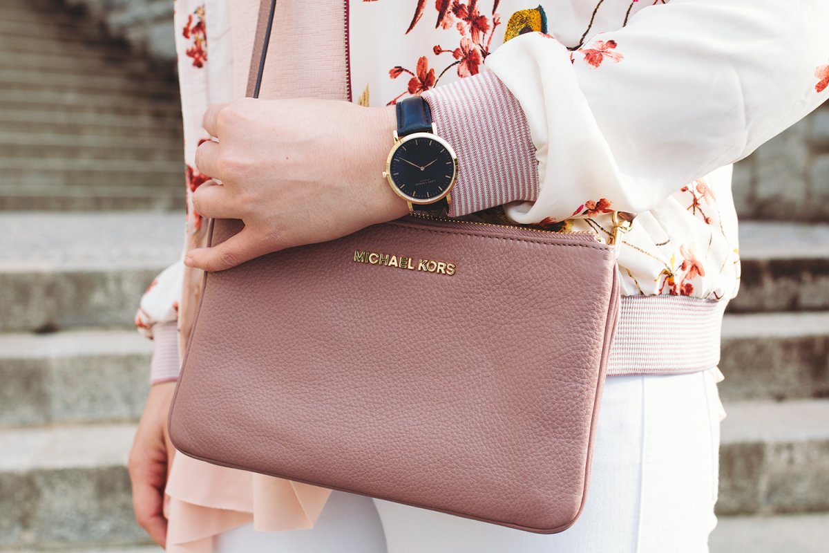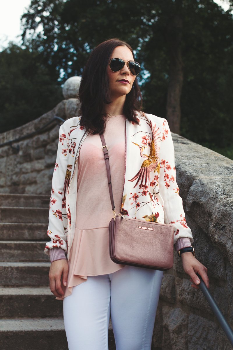 Zu der klassischen Damen Uhr kombiniere ich die Farben Weiß und Rosa. Wie ihr wisst, mag ich weiß im Sommer sehr gerne, das habe ich euch schon in meinem schwarz-weißen Look bereits verraten. Heute setzte ich Weiß mit etwas Farbe in Szene, und zwar ganz dezent mit einem zarten Rosaton. Ein besonderer Hingucker ist dabei die helle Bomberjacke mit frühlingshaftem Print. Als ich die Jacke das erste Mal gesehen habe, habe ich mich gleich in sie verliebt. Nach so einem Teil war ich schon eine ganze Weile auf der Suche und bin jetzt umso glücklicher, dass ich es gefunden habe. Den Rest meines Outfits habe ich einfach an die Jacke angepasst. Das heißt, ich habe mir Farben aus der Jacke herausgepickt und mir die entsprechenden Teile in genau diesen Farbtönen gesucht. Das Top wurde in einem zarten Rosaton gewählt und die Hose ganz klassisch, eben in Weiß, ebenfalls wie die Schuhe.