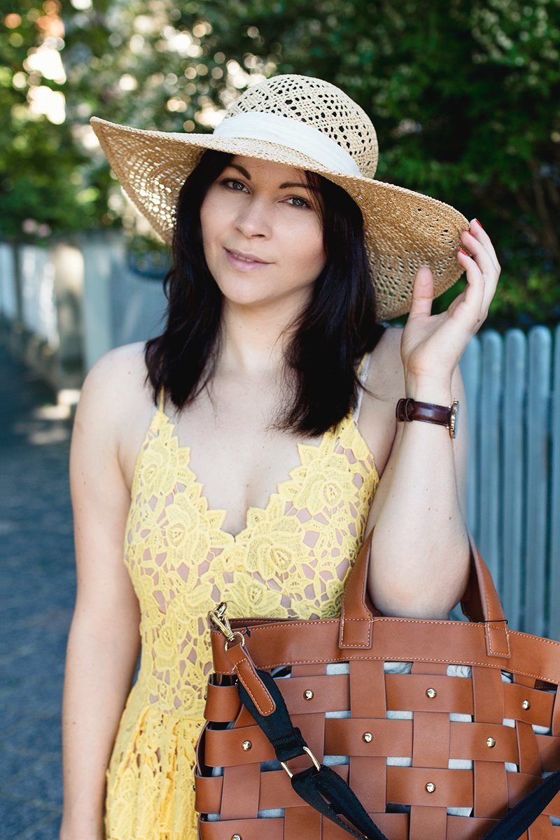 Auch auf dem zweiten Blick wirkt das elegante Sommerkleid nicht langweilig, sodass der Rest meines Looks nach dem Kleid ausgerichtet wird. Ich entscheide mich daher für eine Tasche in einem warmen Braunton und eleganten Strohhut. Auch an den Füßen geht es chic zu, ich trage Espadrilles in Schwarz-Weiß. Aber was wäre der Look ohne Accessoires. Meine heißgeliebte Armbanduhr darf da natürlich nicht fehlen. Ich wähle die Uhr passend zur Tasche in einem warmen Braunton.