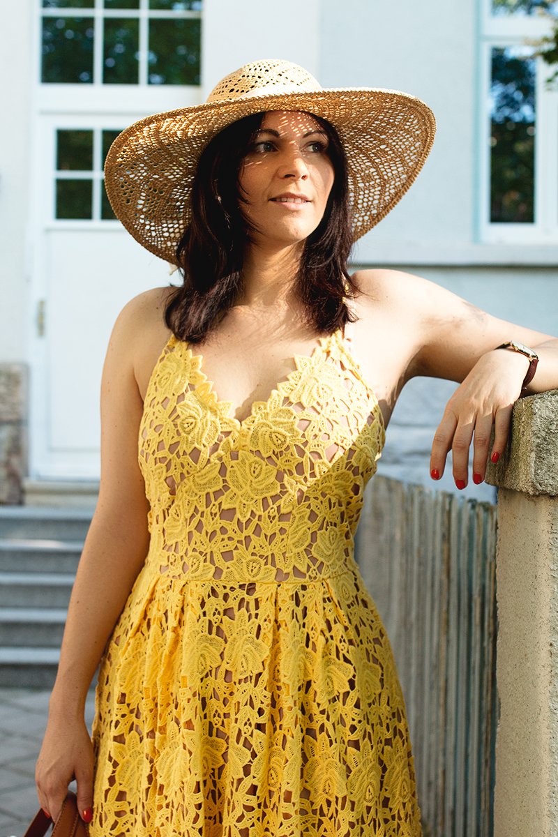 Endlich beginnt der Sommer und ich kann euch meine Outfit mit Spitzenkleid hier auf meinem Modeblog präsentieren. Seit einer Woche haben wir in Erfurt überwiegend Sonnenschein und meine Laune Sommertrends auszuführen, wird immer besser. Den Anfang mache ich heute, mit einem eleganten gelben Spitzenkleid, das ich zum Strohhut und Espadrilles kombiniere.