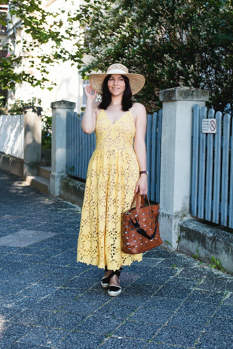 Spitze ist in diesem Sommer einer der Trends, der ausgeführt werden muss. Ein Trend, dem ich bisher nicht sonderlich viel Aufmerksamkeit geschenkt habe, aber der es mir jetzt doch angetan hat. Sommer und Spitze gehören für mich zusammen und werden in Form eines gelben Spitzenkleides präsentiert. Das Kleid ist das Herzstück dieses Outfits und wirkt solo getragen wie ein großartiges Highlight!