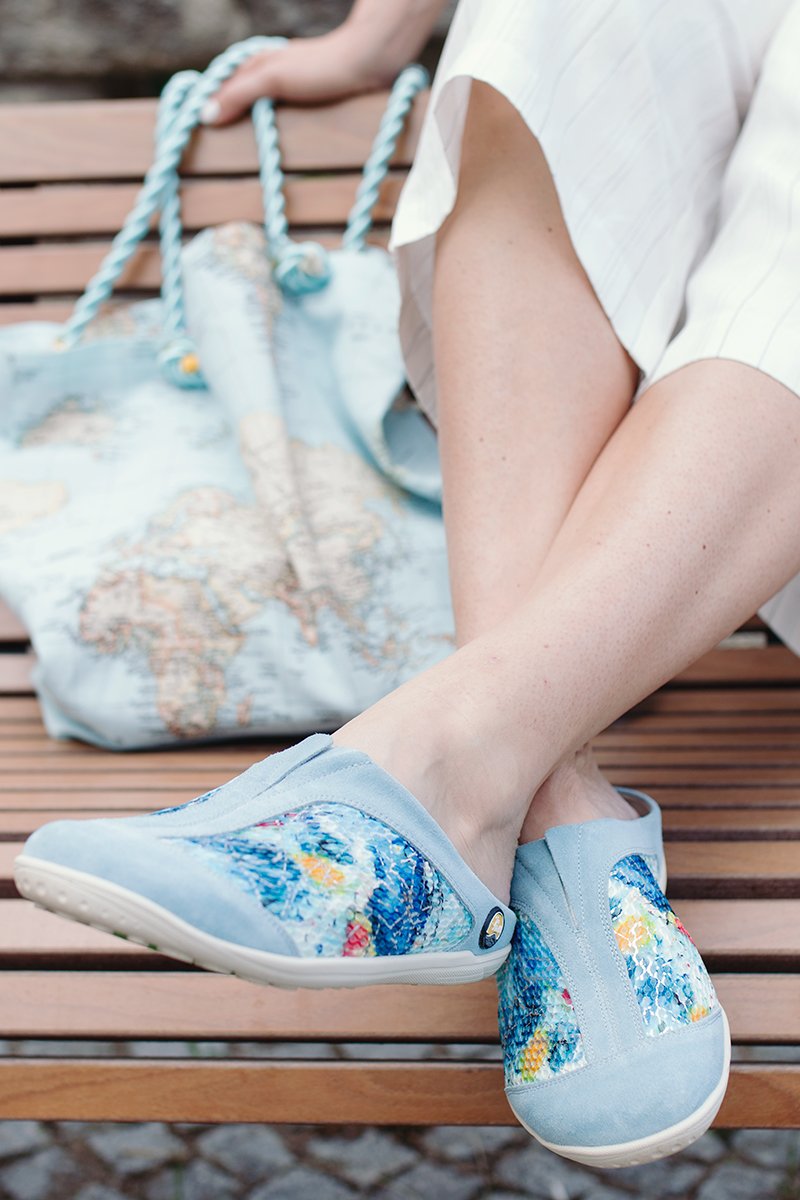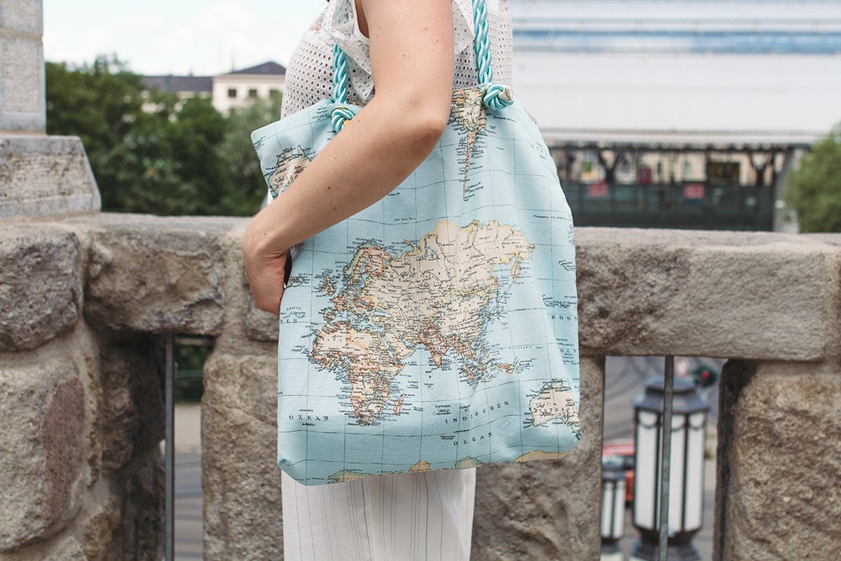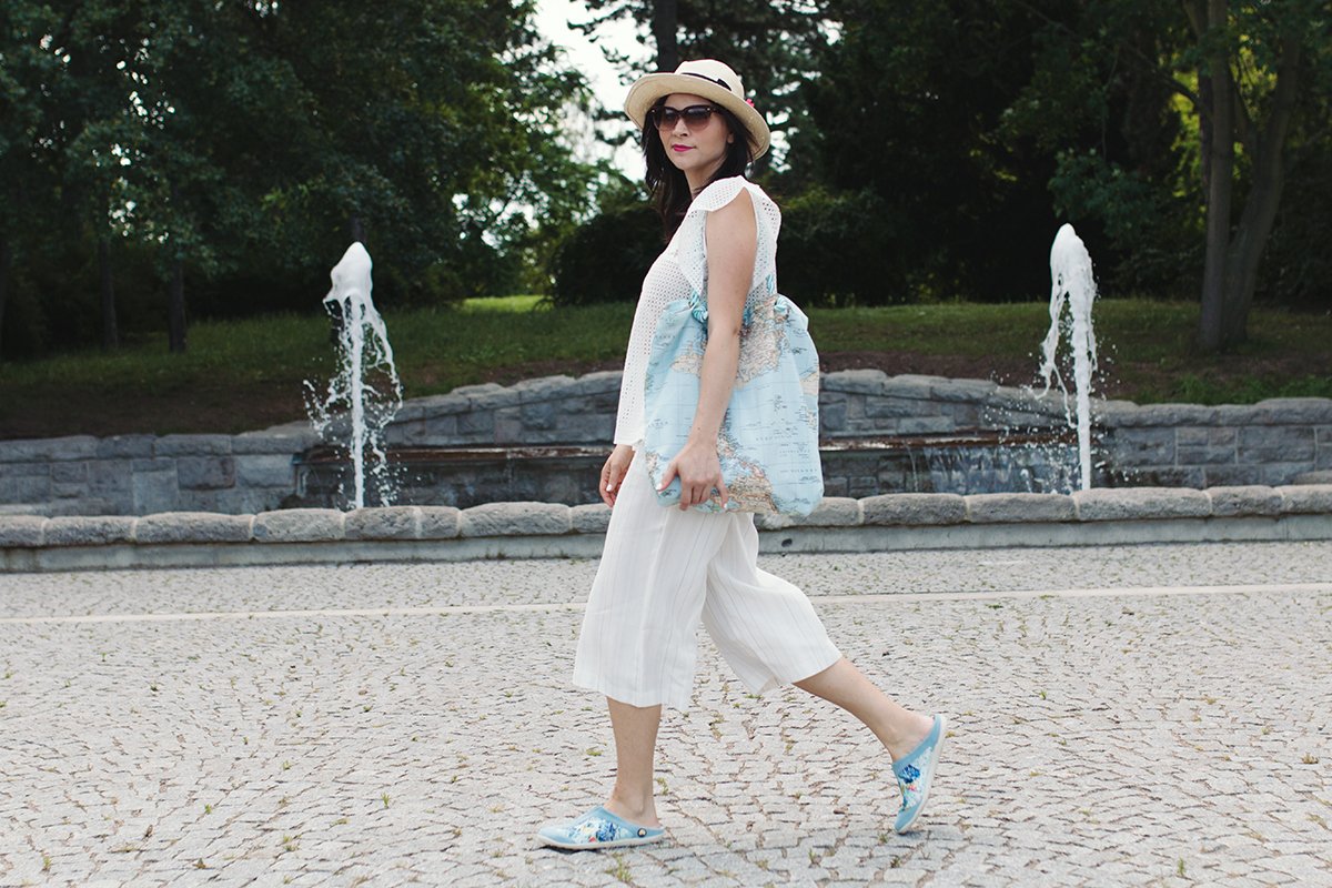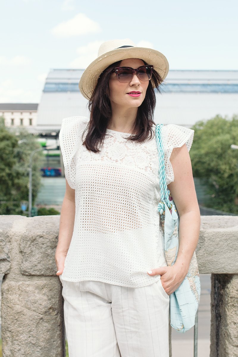 Zu den fJoe Nimble Schuhen trage ich eine weiße Culotte mit Streifen. Dass ich auf Streifen stehe, wisst ihr bereits aus diesem Outfit, auch dort ist eine gestreifte Culotte mit im Spiel. Da ich jetzt zwei diese schönen Hosen im Schrank habe, ist immer eine griffbereit und ich kann Streifen rund um die Uhr ausführen. Zu weiter Hose kombiniere ich eine weiße Lochmusterbluse von Set. Die Bluse gibt dem Look seine Chicness und ist einfach superschön. Um das Blau der Schuhe noch einmal aufzugreifen, wähle ich eine blaue Tasche mit Weltkartenprint. Die Tasche passt einfach supergut zum Sommer und ist der perfekte Begleiter, egal ob man Shoppen geht oder zum Baggersee aufbricht. Auf dem Kopf setze ich noch einen Strohhut und fertig ist mein entspannter Sommerlook.