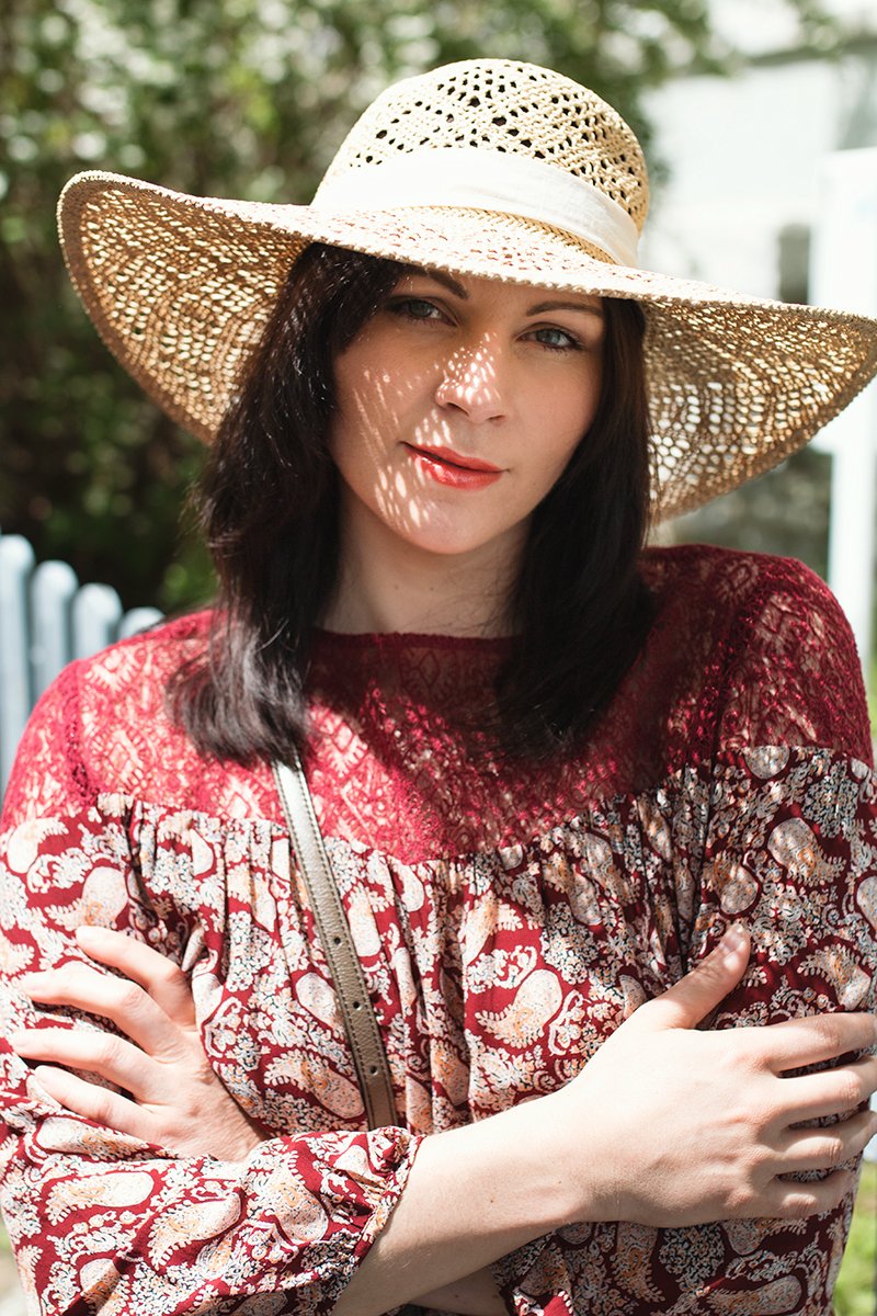 Der Fashionkarussell Look besteht nur aus warmen Farben. Besonders Rot und Brauntöne wirken sehr harmonisch zusammen und ergänzen sich wunderbar. Durch das lebendige Muster des Kleides braucht es nicht viel, damit der Look vollständig wirkt. Auf den Kopf setzte ich wie auch in Outfit mit Spitzenkleid auf einen großen Strohhut. Der ist einfach super um sich vor der Sommer zu schützen und wirkt dazu noch elegant. Um die Schulter schwinge ich mir zum Abschluss noch eine taupfarbene Tasche und fertig ist mein Outfit mit flachen Pantoletten.