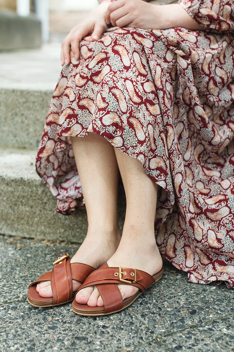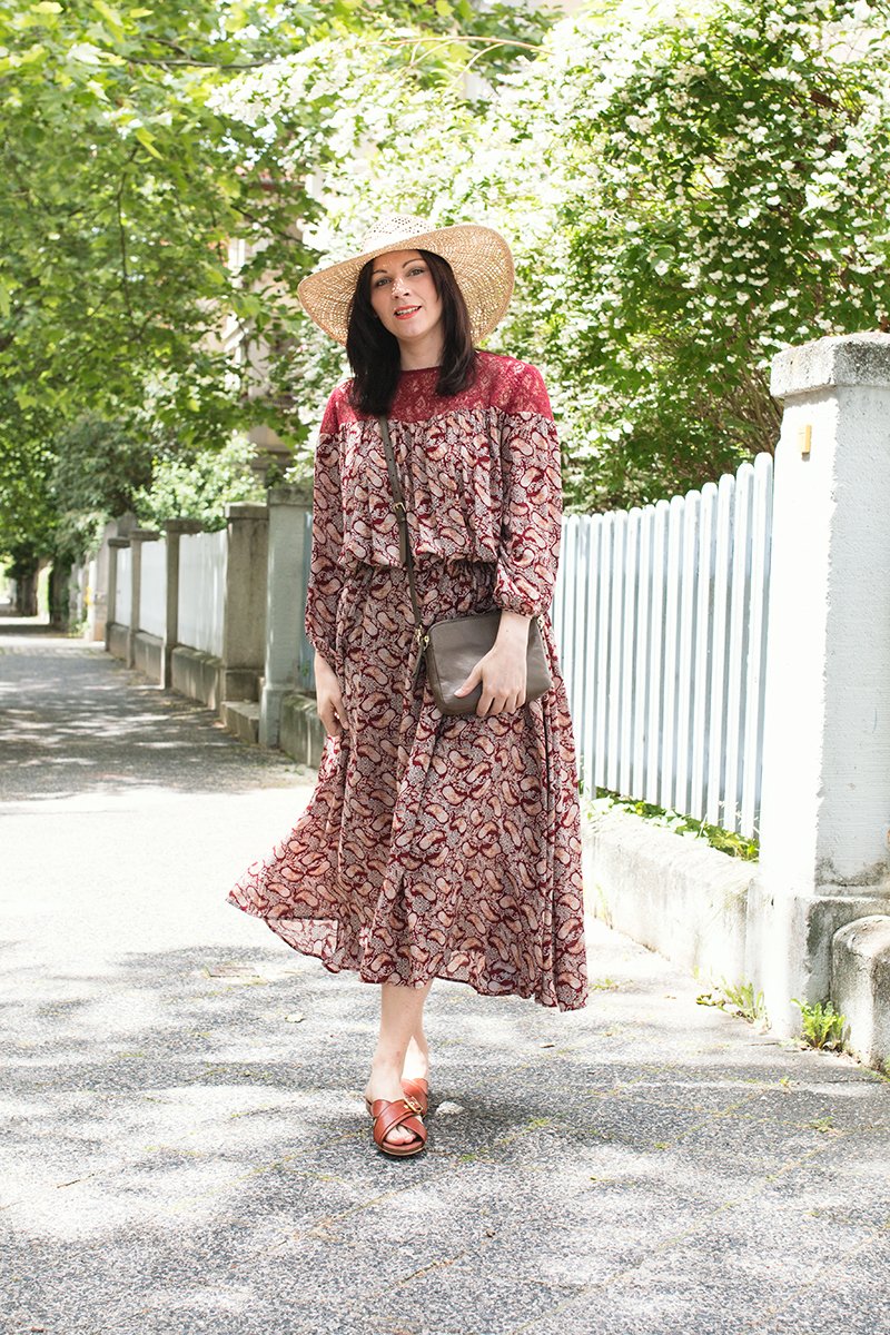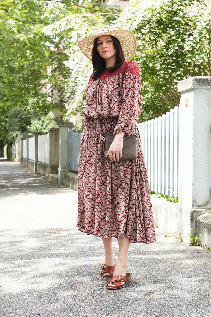 Mein heutiges Outfit ist ein richtiger Sommerlook, den Frau in der Stadt oder im Urlaub tragen kann. Ich kombiniere ein Midikleid mit Paisleymuster zu den braunen Pantoletten. Et voilà und schon ist das Outfit fertig! Das ist der Vorteil von Kleidern, sie kleiden Frau und gestalten im Nu ein ganzes Outfit. So kommt es, das Frau binnen weniger Minuten fix und fertig in der Tür steht, sich so schnell in Schale geworfen hat, dass sie den Liebsten sogar in den Schatten stellt.