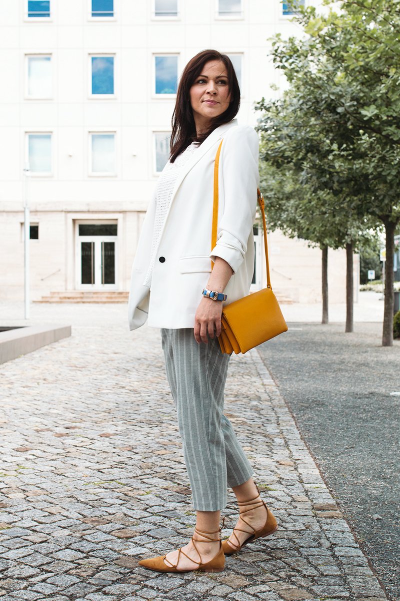 Zurück zum Outfit. Diesen Sommer setze ich auf helle Farben und so war für mich klar, dass einer meiner Looks auf der Fashion Week vorwiegend in hellen Farbnuancen sein soll. Ich entschied mich für eine auffällige Lochmusterbluse und einer lässigen Streifen Hose in Weiß und Grau. Abgerundet wird mein Outfit mit dem weißen Boyfriendblazer.