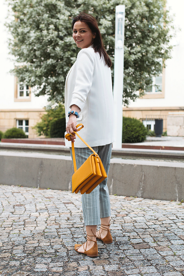 Schönes Outfit! Besonders die Hose hat es mir total angetan. Und die gelbe Tasche ist nochmal ein richtiger Eyecatcher 🙂