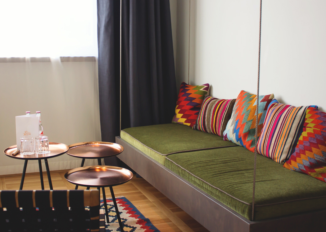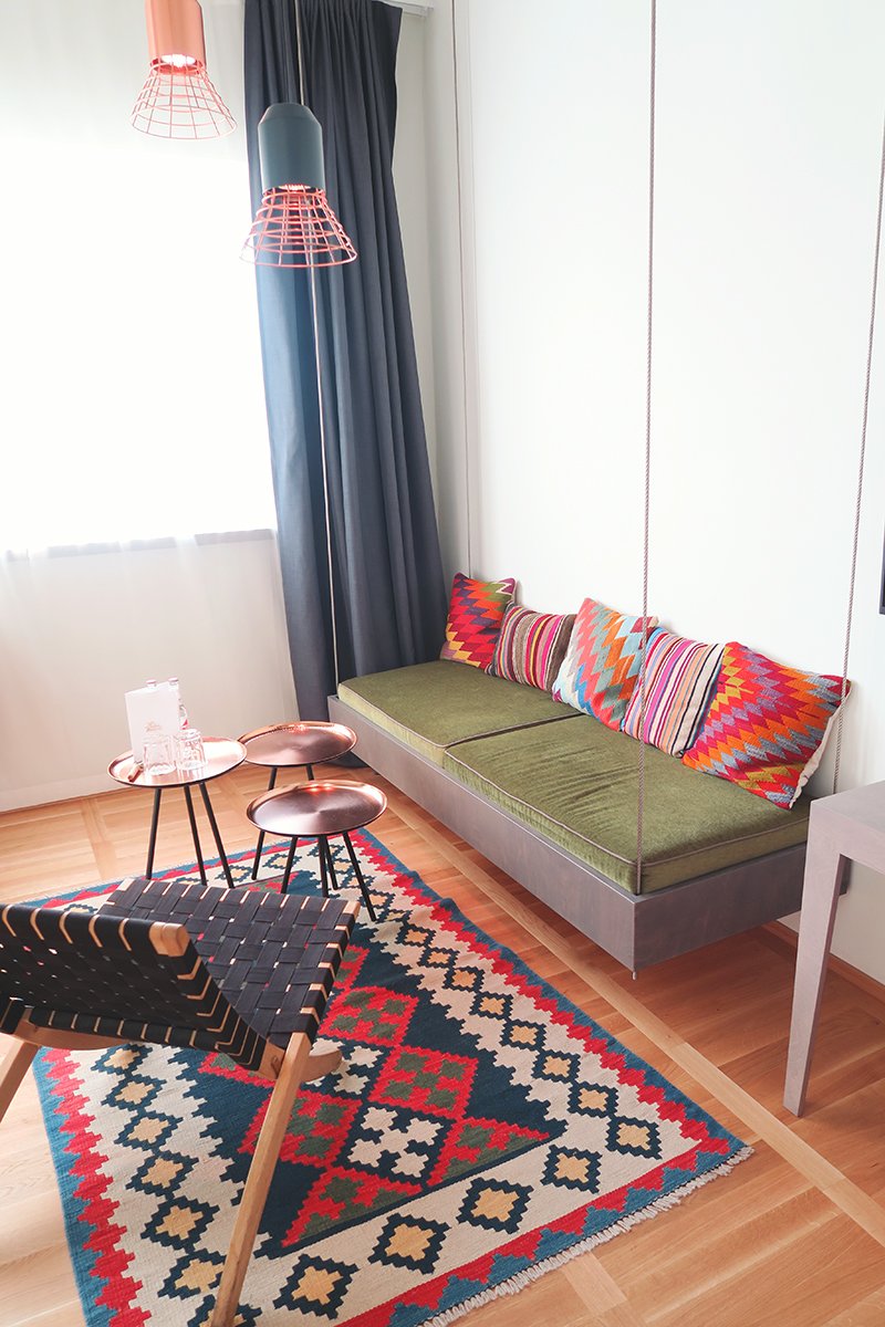 Als sich die Tür zu meinem Zimmer öffnete, stockte mir der Atem, denn das Zimmer war einfach von der Decke bis zum Fußboden nach meinem Geschmack. Ich hatte das Gefühl, es ist bei der Konzeptionierung dieses Raums wirklich an alles gedacht worden. Neben dem großen Bett, das förmlich in der Luft schwebte, lud eine Retro Sofa zum Verweilen ein. Ganz besonders gut haben mir die bunten Kissen gefallen und der schwarze Sessel, der sich als superbequem entpuppte. Genau so ein Sessel fehlt mir noch in meiner Wohnung! Habt ihr Tipps, woher ich so ein schönes Stück bekomme?