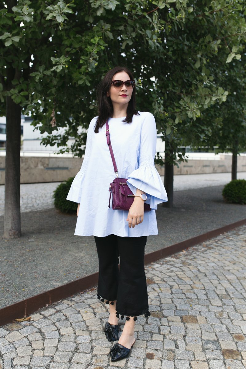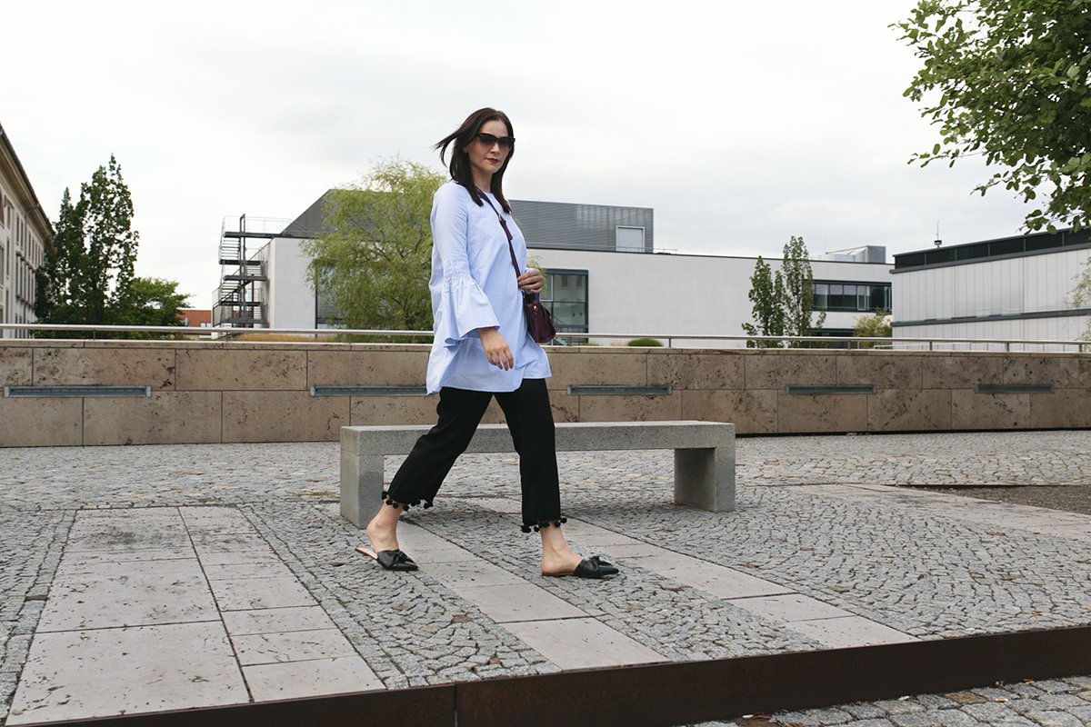 Ich sollte lediglich die Schuhe und eine andere Hose wählen, denn diese sind doch etwas für wärmere Tage. Übrigens habe ich jetzt endlich die heißbegehrten Mules gekauft und sie gleich in diesem Outfit abgelichtet. Nachdem ich die teurere Variante von Topshop zur Anprobe zu Hause hatte, war ich etwas enttäuscht, denn die Schuhe sahen an meinem Füssen klobig aus und wurden zurück gesendet. Letztendlich habe ich mich für diese dezenter Variante von Zara entschieden, diese passt nicht nur zu luftigen Hosen super, sondern auch zu engen Skinny Jeans.