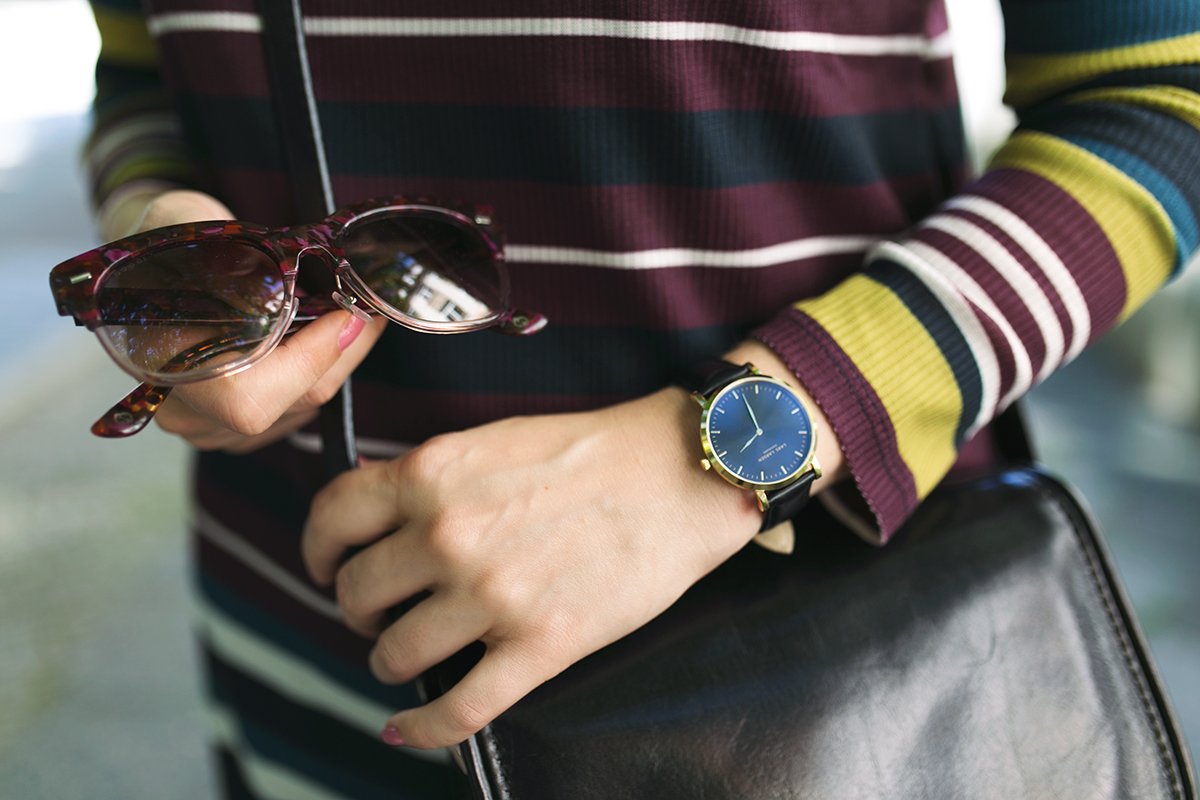Das farbenfrohe Kleid lässt jede Menge Spielraum für passende Accessoires. Ich habe mich bei diesem Look für eine Kombination aus einem Beerenton und Schwarz entschieden. Den Beerenton greife ich bei meiner Sonnenbrille auf und den Schwarzton findet sich in Tasche und Uhr wieder. Den Beerenton trage ich zudem auf den Lippen sowie auf meinen Nägeln spazieren und gebe dem Outfit eine vollkommen runde Note.