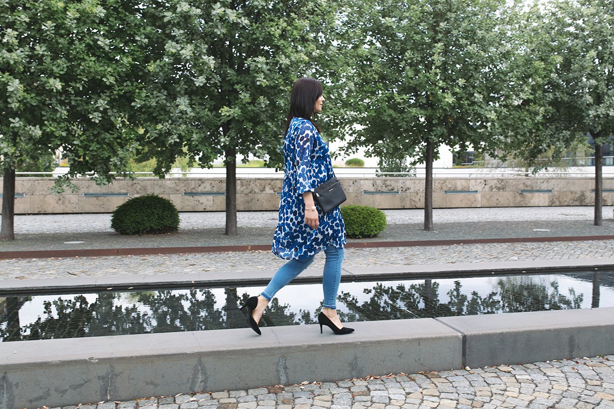 In einem blau-schwarzen Look bewege ich mich langsam in den Herbst. Das Gute an so einem Outfit ist es, dass er im Nu sommertauglich ist. Alles was ihr tun müsst, ist auf die Hose zu verzichten. Das Kleid ist lang genug, weit geschnitten und schön luftig. Besonders gut gefällt mir das auffällige Muster, dass mir als Print-Liebhaberin den Kopf verdreht hat. Ich bin ein wenig verliebt in dieses schöne Kleid, ich denke, es wandert auch gleich in meinem Urlaubskoffer. Zu Hause lasse ich hingegen meine blaue Jeans, denn da wo ich hin düse, benötige ich sie nicht :). Dafür nehme ich noch ein paar Röcke und Shorts mit und natürlich meine Birkenstock Sandalen. Auch wenn die schwarzen Pumps superbequem sind, bleiben sie auch zu Hause und warten auf ihren großen Einsatz im Herbst.