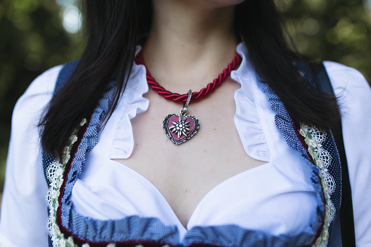 In dieser Saison habe ich mich für ein Dirndl in unterschiedlichen Blaunuancen entschieden. Es ist ein Stück, das wohl nicht so schnell aus der Mode kommt und auch noch in der nächsten Saison getragen werden kann. Was mir an diesem Dirndl sehr gut gefällt, sind die kleinen Akzente mit weißer Bordüre und roten Samt, die ich auch bei der Wahl meiner Accessoires wieder aufgegriffen habe. Ich finde, Rot und Blau bilden einen wunderschönen Farbkontrast, der einen sehr frisch und natürlich wirken lässt.