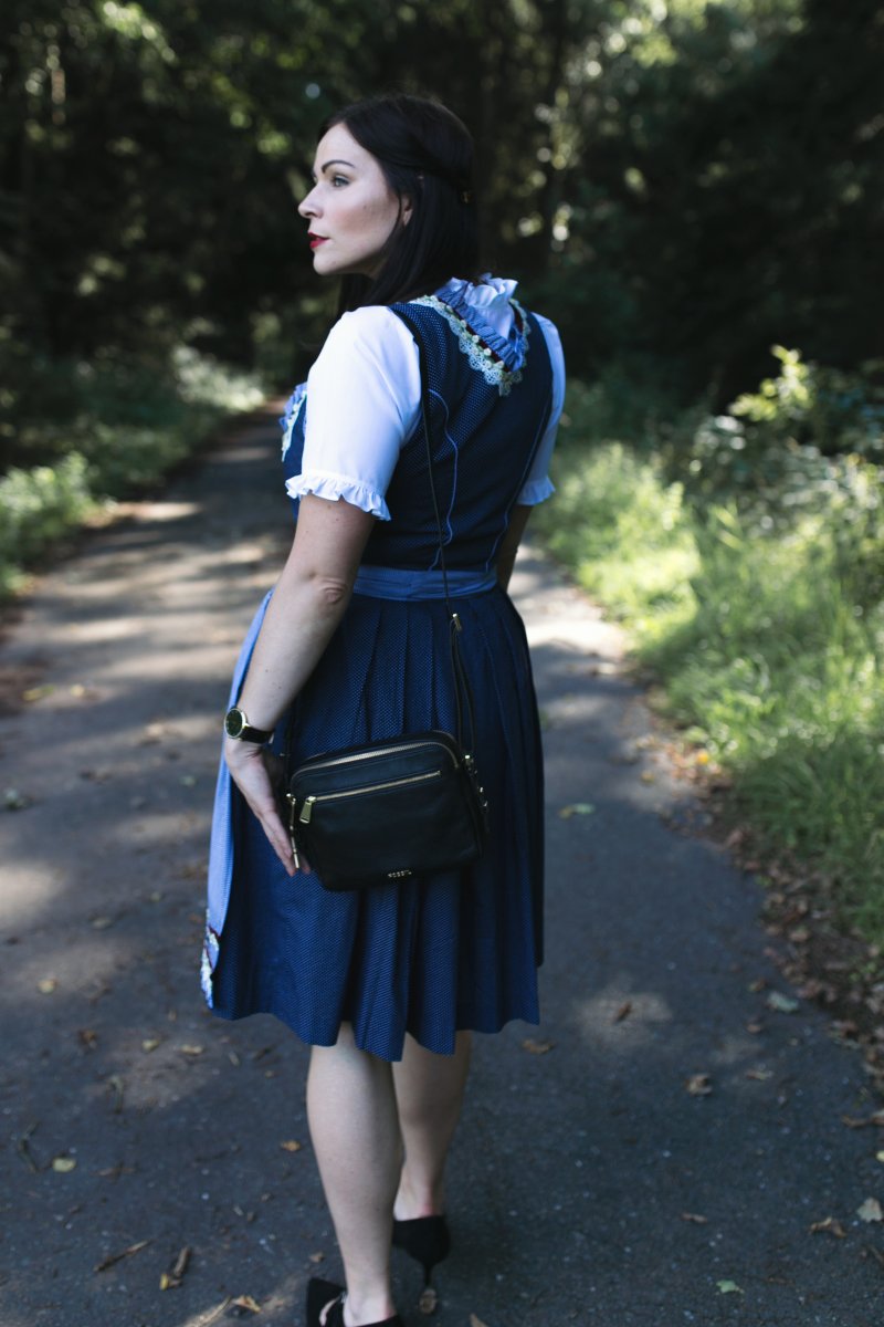 Ich wähle die Accessoires immer passend zu meinem Dirndl aus. Entweder greife ich eine Farbe aus dem Dirndl auf oder ich entscheide mich für eine neutrale Farbe wie Creme oder Schwarz. Das passt immer. Bei der Schuhwahl bin ich eher dezent und zurückhaltend, ich trage entweder flache Ballerinas oder Midipumps zu der Tracht, dadurch kommen die Beine noch einmal mehr zur Geltung.