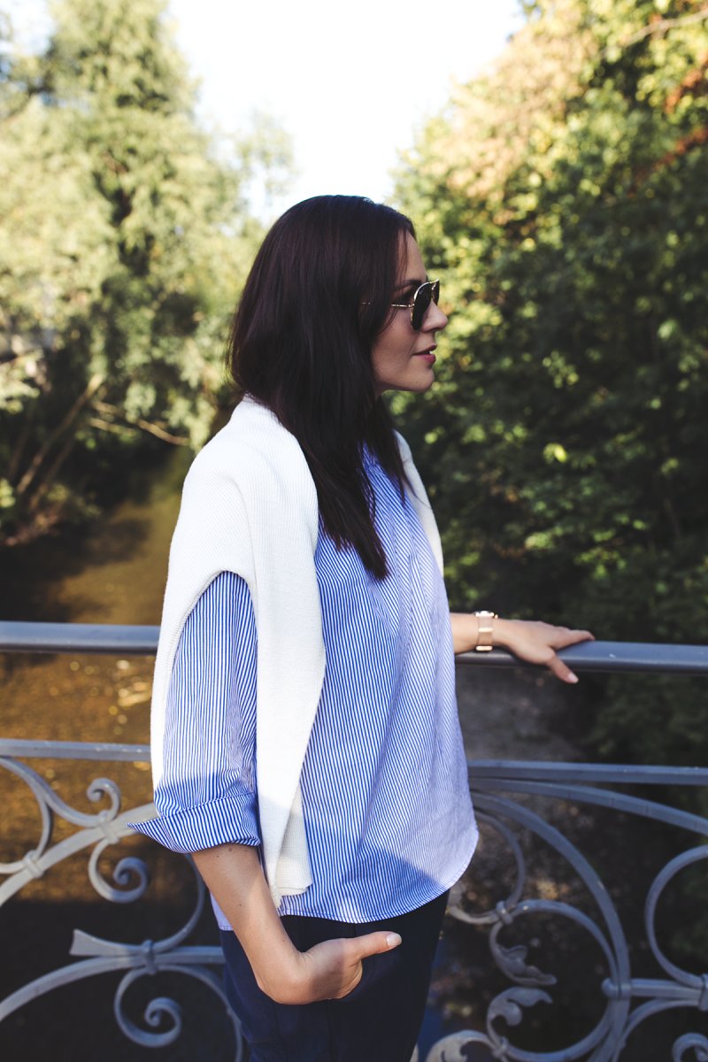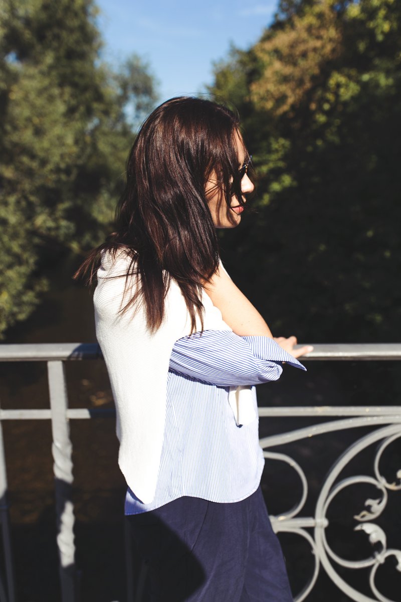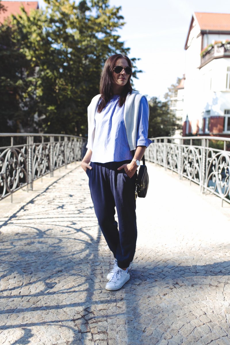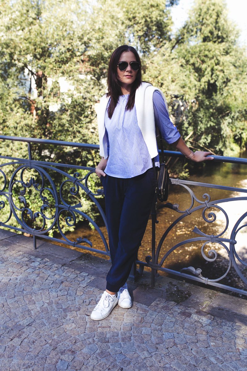 In meinem heutigen Outfit setzte ich auf einen sportlich-eleganten Mix, was die Outfit-Wahl betrifft. Ich trage eine Off-Shoulder Bluse zu einer gemütlichen Hose in Dunkelblau. Die Hose ist am Knöchel mit einem Bund eingefasst, was sie zum sportlichen Begleiter für unsere Radtour werden lässt. Welche Schuhe würden da besser zu der Hose passen, als meine heiß geliebten Stan Smith Sneakers von Adidas. Diese Schuhe werden mich auch diesen Herbst/Winter wieder begleiten, zumindest solange wie es wettertechnisch möglich ist.