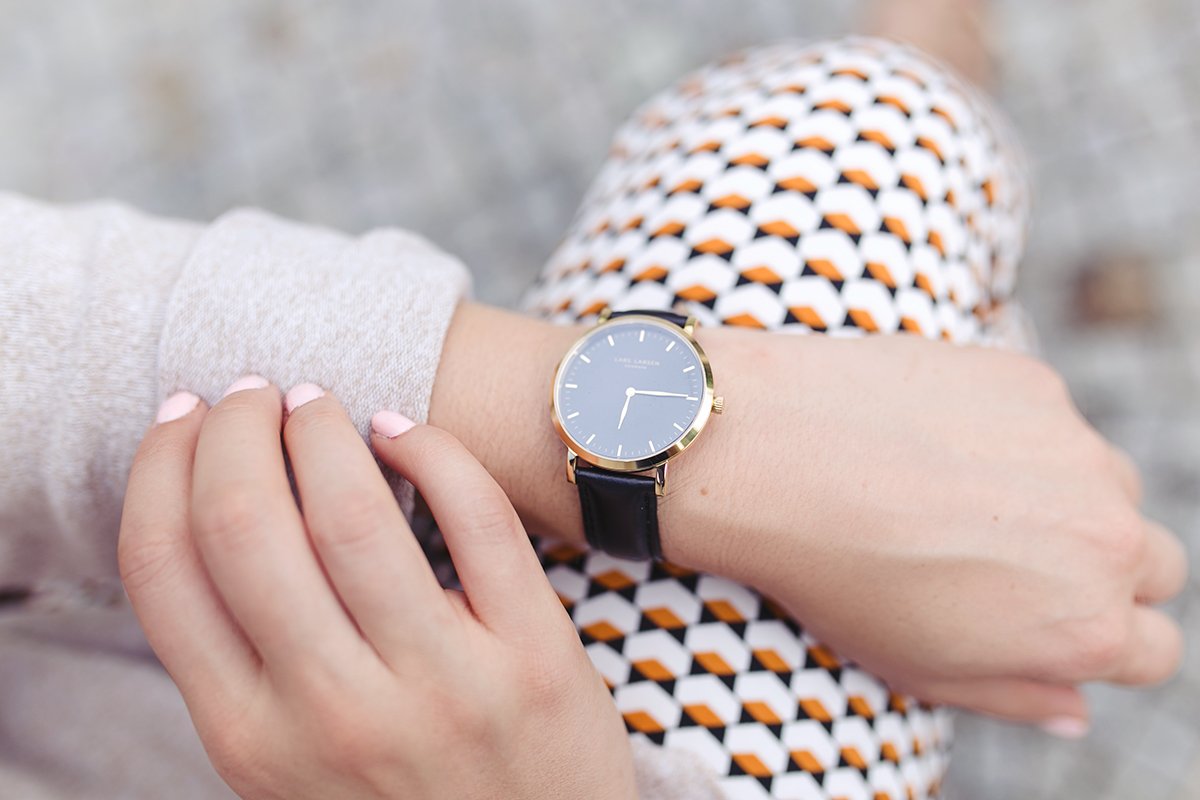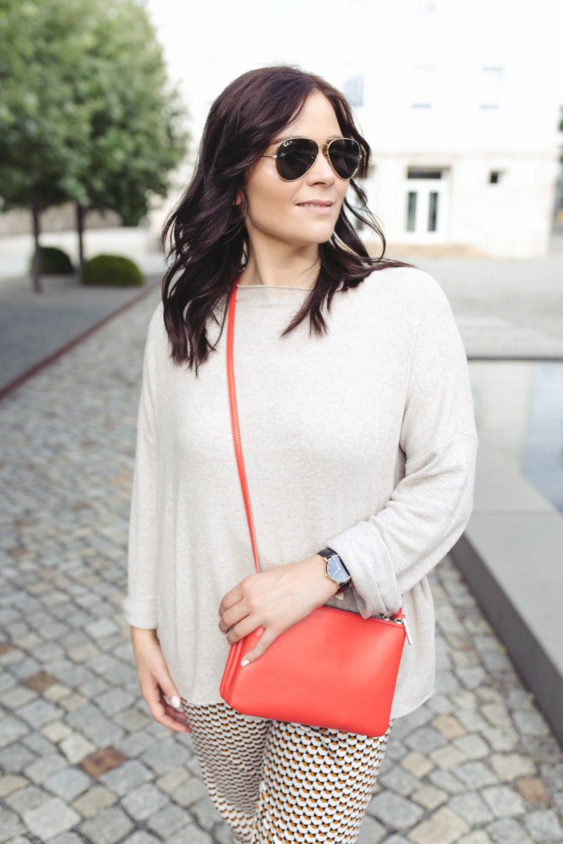 Die Hose vereint ebenfalls warme Nuancen in ihrem Muster und passt farblich dadurch sehr gut zu den Sandalen. Auch der Pullover, den ich zu diesem Look gewählt habe, hat einen beigefarbenen Einschlag. Als kleinen Eyechatcher habe ich eine Tasche im auffälligen Orange-Rot gewählt. Diese verleiht dem Look noch einmal den letzten Schliff und greift ganz beiläufig den Orangetone der Hose noch einmal auf.