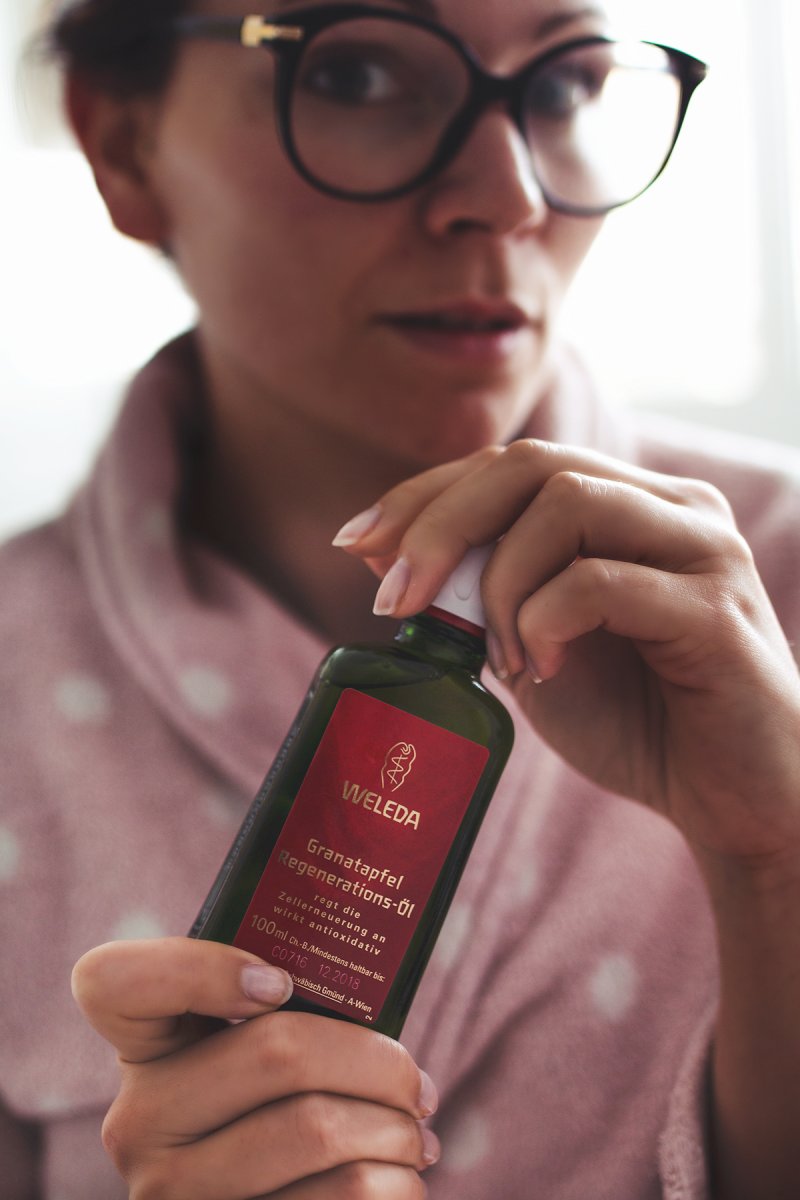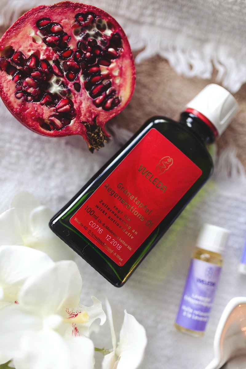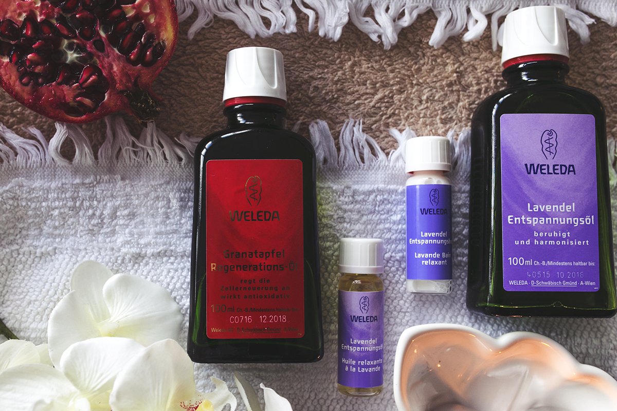 In meiner Home-Spa-Routine befinden sich derzeit 2 Öle von Weleda. Zum einen das Lavendel Entspannungsöl, das ich euch in meinem Top 5 Hand- und Nagelpflege Produkte Beitrag schon vorgestellt habe und zum anderen das Granatapfel Regenerations-Öl, das ganz neu bei mir eingezogen ist.