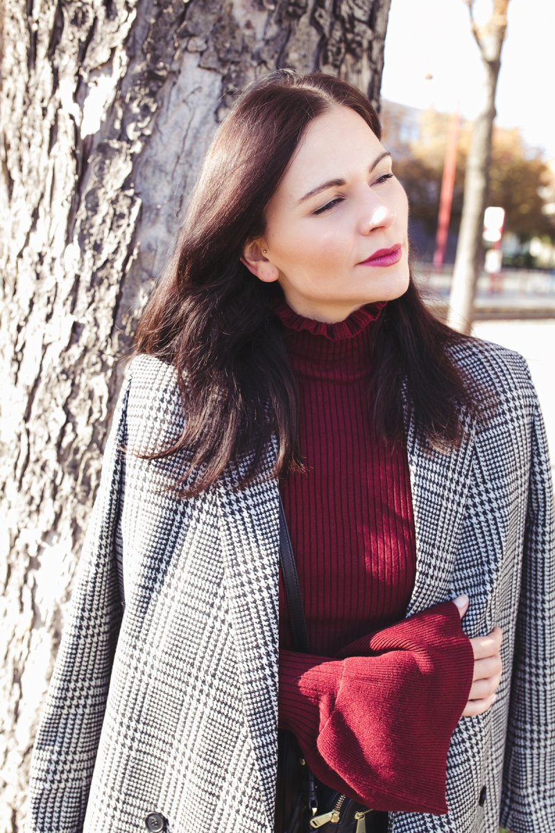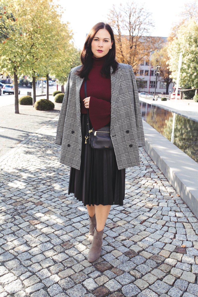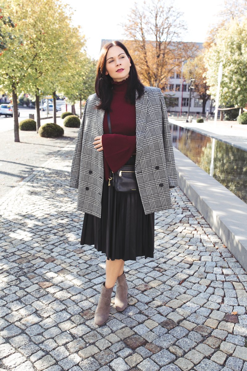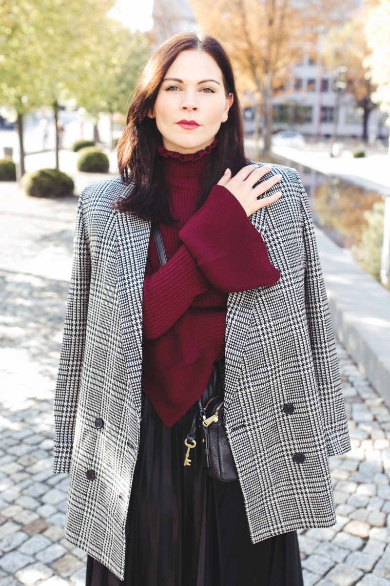Der Herbst ist bei mir angekommen oder besser gesagt in meinem Kleiderschrank. Ich kleide mich in meinem heutigen Outfit in meine liebste Herbstfarbe Bordeaux. Die dunkelrote Farbe ist im Herbst mein liebster Begleiter. Deshalb stelle ich sie euch heute in einem Outfit mit kariertem Blazer, Midirock und Rollkragenpullover vor.